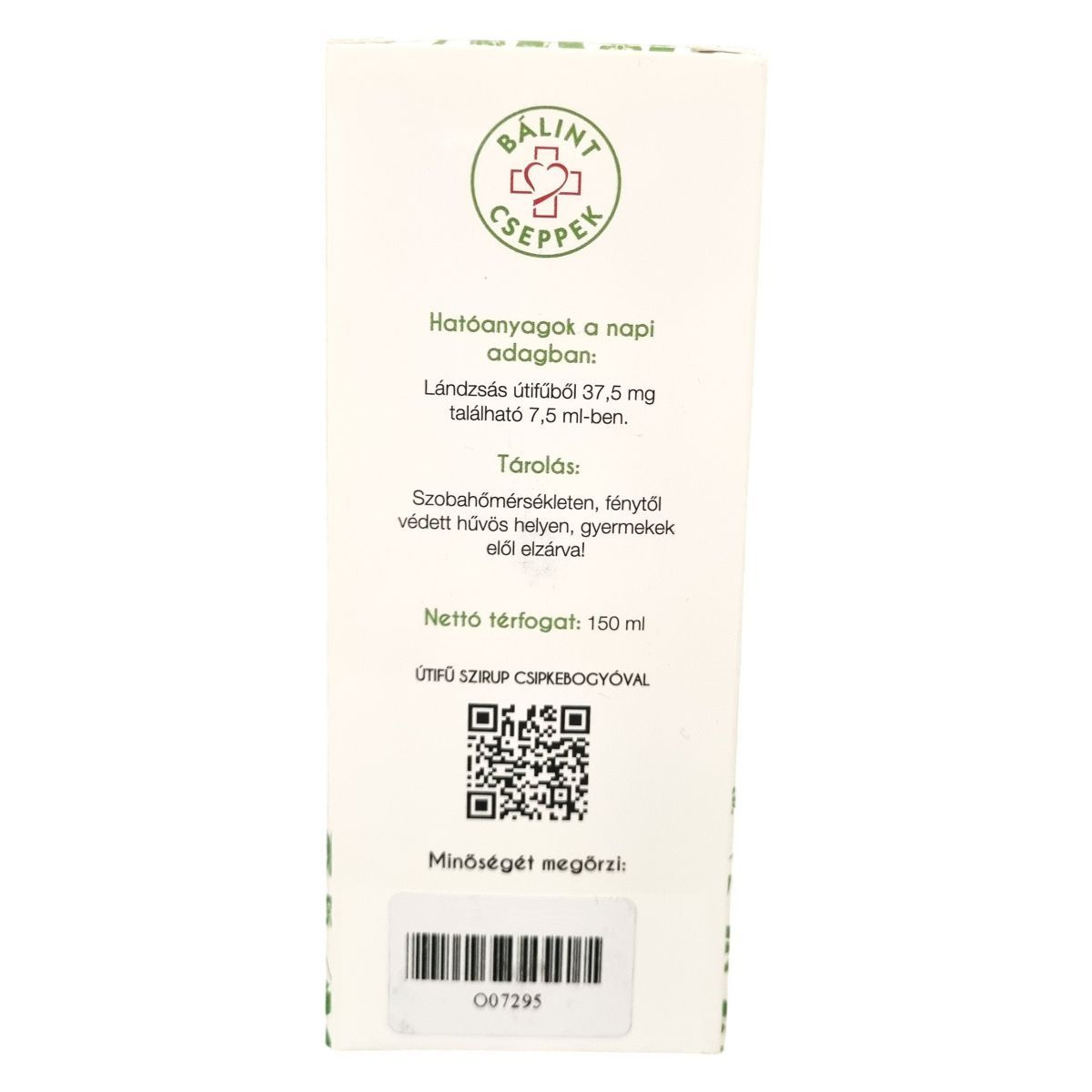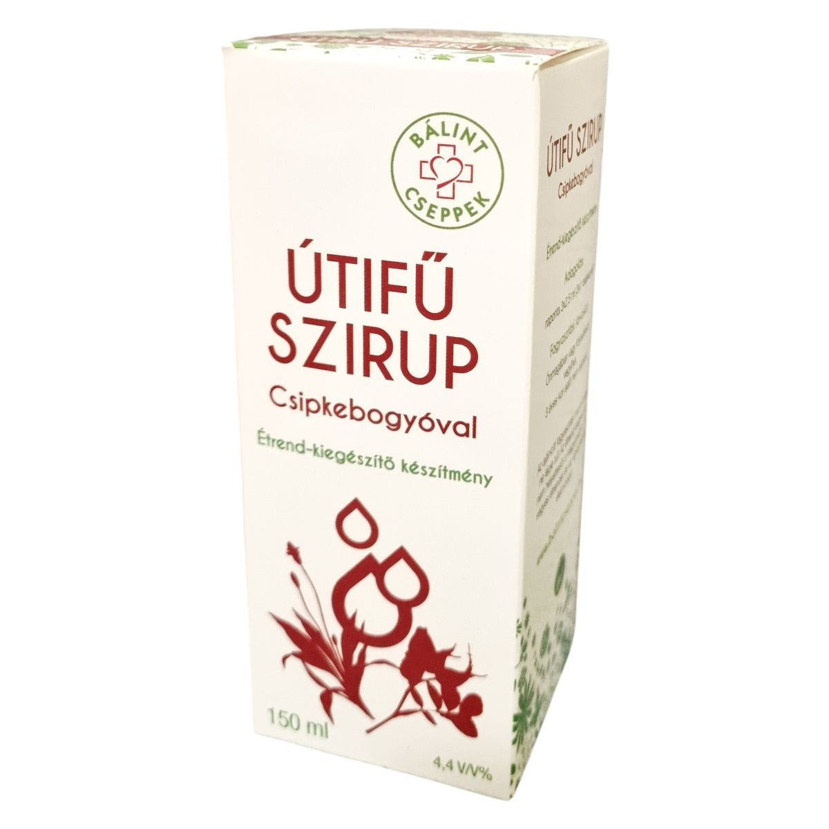A BÁLINT ÚTIFŰ SZIRUP Csipkebogyóval 4,4 V/V% alkoholtartalmú, 150 ml-es kiszerelésű termék. Hatóanyag-tartalma lándzsás útifű kivonat, amely 37,5 mg mennyiségben található meg 7,5 ml napi adagban. Az összetevők között fehér szőlőlé sűrítmény, csipkebogyó sűrítmény (10%), valamint a növényi alapú lándzsás útifű kivonat szerepel. A termék magyarországi származású, és javasolt adagolása naponta háromszori, egyenként 2,5 ml (egyszeri teáskanálnyi mennyiség). A szirup fogyasztása 3 éves kor alatt nem ajánlott, és ajánlott nem túllépni az ajánlott napi mennyiséget. Felhívja a figyelmet arra, hogy az étrend-kiegészítő nem helyettesíti a kiegyensúlyozott vegyes étrendet és az egészséges életmódot. A terméket szobahőmérsékleten, fénytől védett, hűvös helyen, gyermekektől elzárva kell tárolni.