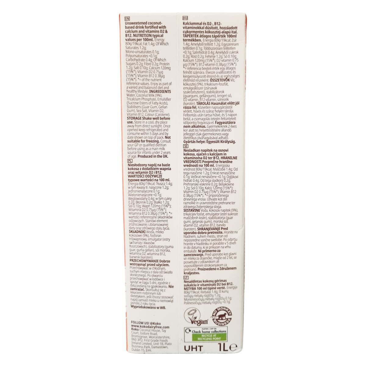 A Koko cukormentes kókuszital egy könnyű, semleges ízű növényi ital, amely alacsony zsírtartalmú, hozzáadott kalciummal és D2-, valamint B12-vitaminnt is tartalmaz.
