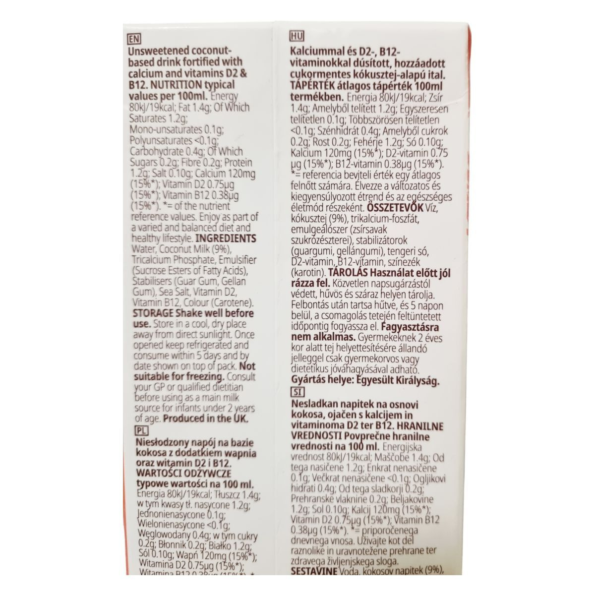 Víz, kókusztej (9%), trikálcium-foszfát, emulgeálószer (zsírsavak szacharóz-észterei), stabilizátorok (guargumi, gellángumi), tengeri só, D2-vitamin, B12-vitamin, színezék (karotin).