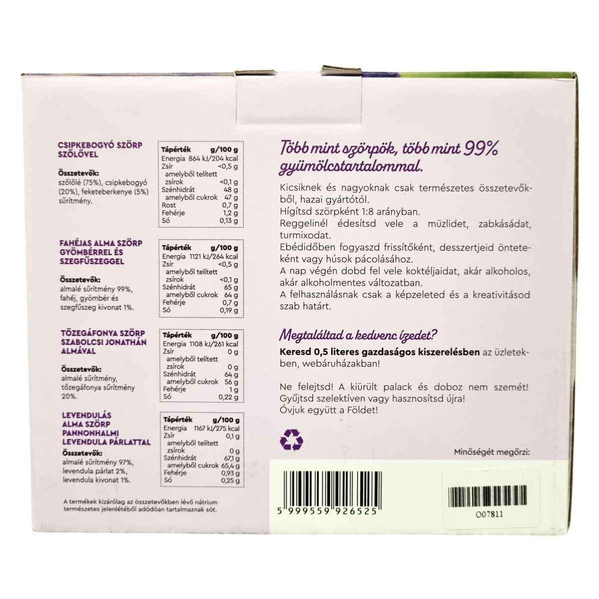 4 különleges szörp egy csomagban: levendulás alma, tőzegáfonya, fahéjas alma és csipkebogyó szőlővel. Természetes összetevőkkel, hozzáadott cukor nélkül, több mint 99% gyümölcstartalommal.