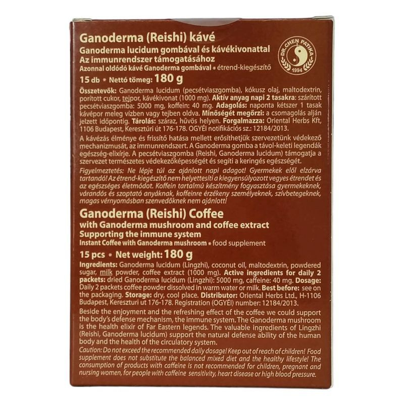Az immunrendszer támogatásához azonnal oldódó kávé ganoderma gombával. A kávézás élménye és frissítő hatása mellett erősíthetjük szervezetünk védekező mechanizmusát, az immunrendszert. A ganoderma gomba a távol-keleti legendák egészség-elixírje. A pecsétviaszgomba (Reishi, Ganoderma lucidum) támogatja a szervezet természetes védekező képességét és segíti a keringés egészségét. Adagolás (felhasználás): naponta kétszer 1 tasak kávépor meleg vízben vagy tejben oldva. Összetevők: ganoderma lucidum (pecsétviaszgomba), kókusz olaj, maltodextrin, porított cukor, tejpor, kávé kivonat. Hatóanyagok a napi adagra: napi 2 tasakra: szárított pecsétviaszgomba: 5000 mg, koffein: 40 mg.