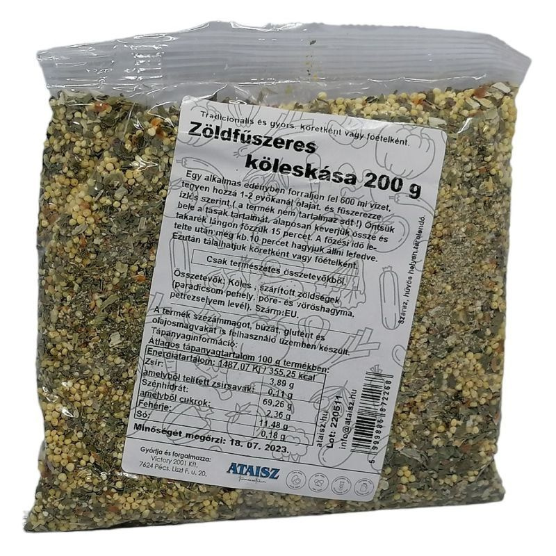 Összetevők: köles (EU), szárított zöldségek (paradicsom pehely, póré- és vöröshagyma (Kína), petrezselyem levél (EU).