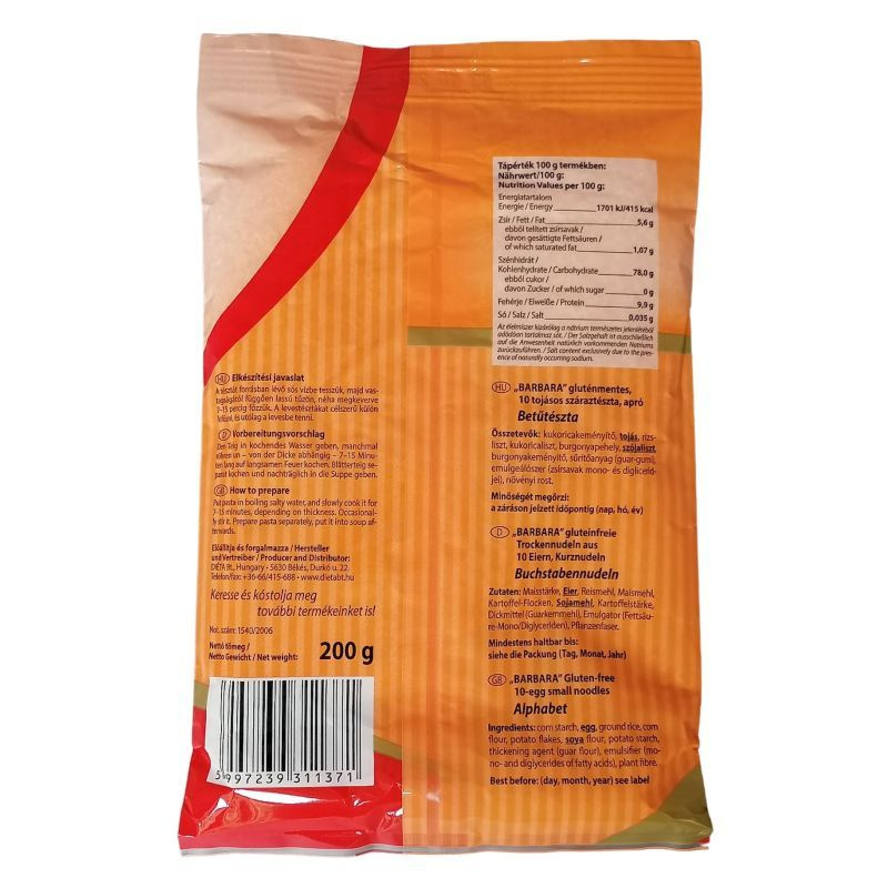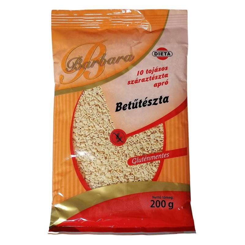 A betűtészta tojással, kukoricakeményítőből és rizslisztből készül, kifejezetten gluténérzékenyek számára.