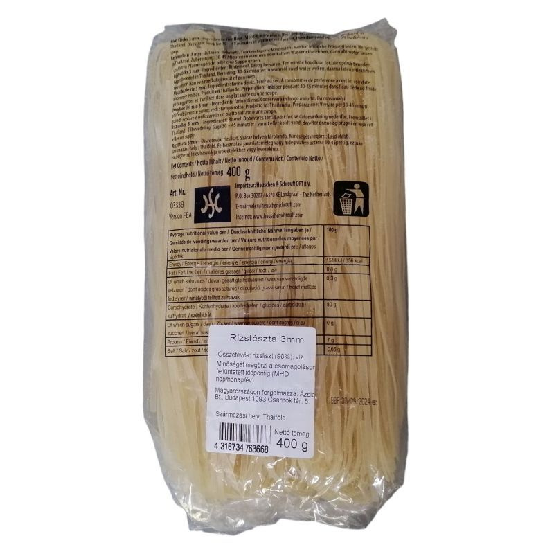Ez a rizstészta sokoldalúan felhasználható a konyhában. Kiválóan alkalmas levesek, például pho vagy ramen készítéséhez, de salátákban is megállja a helyét, ahol friss zöldségekkel és ízletes öntetekkel kombinálva tálalható. A rizstészta tökéletes választás lehet vegetáriánus és vegán ételekhez is, hiszen húsmentes alapanyag, amely könnyen variálható különböző ízekkel és hozzávalókkal. Az Ázsia rizstészta 3 mm-es vastagsága lehetővé teszi, hogy a tészta jól megőrizze formáját és állagát, így bármilyen ételhez remekül illeszkedik.