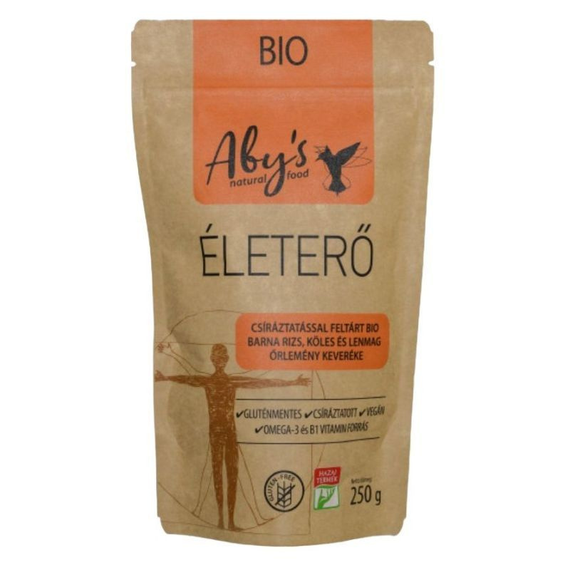 Az ABY Bbio mesterkeverék - bio csíráztatott barna rizs, köles-, arany lenmag őrlemény keveréke. Omega - 3 zsírsavakban gazdag, B-vitaminokat tartalmaz. B1-vitamin hozzájárul az idegrendszer normál és a szív megfelelő működéséhez. Emészthető formula. Élelmi rostban gazdag. A csíráztatás során aktiválódó enzimek hatására, a szervezetünk számára könnyen hasznosítható ásványi anyag-, vitamin-, szénhidrát-, esszenciális aminosav- és zsírösszetétel alakul ki. A csírázás hatására a gabona magokban található emésztést gátlók lebomlanak, így javítva a gabona meglévő kiváló tulajdonságait. A B1-vitamin részt vesz a normál energiatermelő anyagcsere- folyamatokban, hozzájárul az idegrendszer normál és a szív megfelelő működéséhez. A B6-vitamin hozzájárul a fáradtság csökkentéséhez. Az Omega-3 megnevezés a többszörösen telítetlen zsírsavak egyik csoportját jelöli. Az Omega-3 zsírsavak fontos szerepet játszanak a szervezet számos élettani folyamatában. Az Omega-3 zsírsav (ALA) fogyasztása hozzájárul a vér normál koleszterinszintjének fenntartásához. A kedvező hatás 2 g alfa-linolénsav (ALA) napi bevitelével érhető el. Élelmi rostban gazdag. Összetevők: bio, csíráztatott gabona magvak őrleménye, barnarizs*(40%), aranyköles* (35%), arany lenmag őrlemény*(25%). * Ökológiai gazdaságból származó összetevő. Száraz, hűvös helyen tárolandó! Felbontás után napfénytől védve 1 hónapig fogyasztható. Átlagos tápérték 100 g termékben: Energia: 1651 kJ/349 Kcal, zsír: 14 g -amelyből telített zsírsavak: 1,3 g -egyszeresen telítetlen zsírsavak: 2,9 g -többszörösen telítetlen zsírsavak: 8,2 g, szénhidrát: 49 g -amelyből cukrok: 1,2 g, rost: 12 g, fehérje: 12 g, só:<0,1 g. Vitaminok, ásványi anyagok 100 g termékben: tiamin: 0,33 mg. A többszörösen telítetlen zsírsavakból 100 g termékben: Omega-3 zsírsavak (ALA): 6,0 g, Omega-6 zsírsavak: 1,7 g.