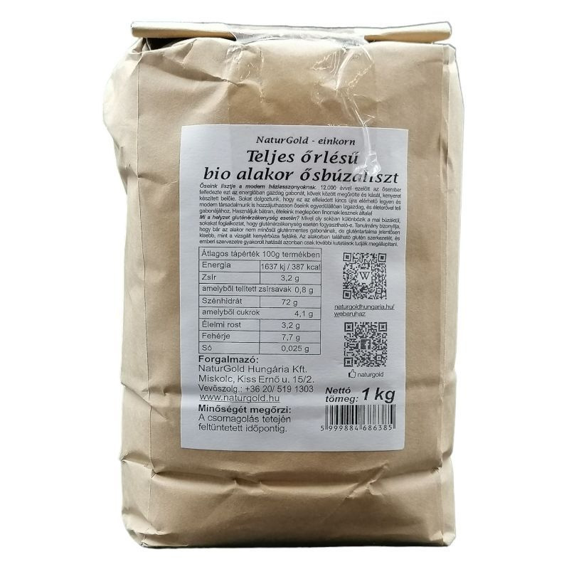 10000 éves kincs, eleink legelső gabonájának, minden búzafajta ősének modern kori finomlisztje. A búza legtisztább formája, a mai búzáknak csak igen távoli rokona. A magbelső sárgás színű finomlisztje a rengeteg béta-karotinnak köszönhető. Univerzálisan használható, bátran ajánljuk főzéshez, sütéshez, omlós sütemények, vajas tészták, palacsinták készítéséhez. Kenyerek, kelt tészták készítéséhez 1/3 arányban használható tönkölyliszthez keverve. Átlagos tápérték 100 g termékben: Energia: 1398 kJ/334 Kcal, fehérje: 13,4 g, szénhidrát: 66,5 g, zsír: 1,7 g, élelmi rost: 6,7 g. Összetevők: bio alakor ősbúza finomlisztUniverzálisan használható. Gluténérzzékenyeknek nem ajánlott a fogyasztása!