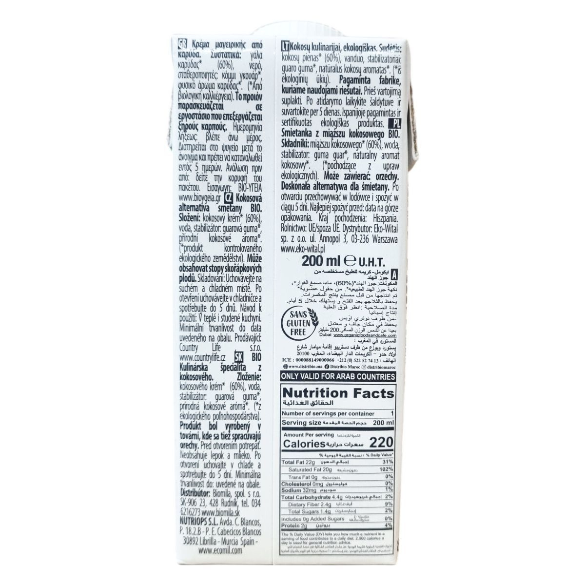 Ez a 200 ml-es, organikus kókusztejből készült kulináris készítmény tökéletes alternatíva a hagyományos tejalapú termékek helyett, természetes összetevőkkel és stabilizátorral (guargumi) a minőség megőrzéséhez. A csomagolás 88%-ban megújuló forrásból készült, környezetbarát Tetra Pak palackban érkezik. Száraz és hűvös helyen tárolandó, felbontás után hűtőben kell tartani, és 5 napon belül elfogyasztandó. Természetes glutén- és laktózmentességével, valamint vegán jellege miatt széles körben alkalmazható, figyelembe véve, hogy diót is feldolgozó üzemben készül. Az energiatartalma főként telített zsírsavakból származik, minimális cukortartalommal bír, így kíméletes összetételt biztosít az egészségtudatos étkezők számára.
