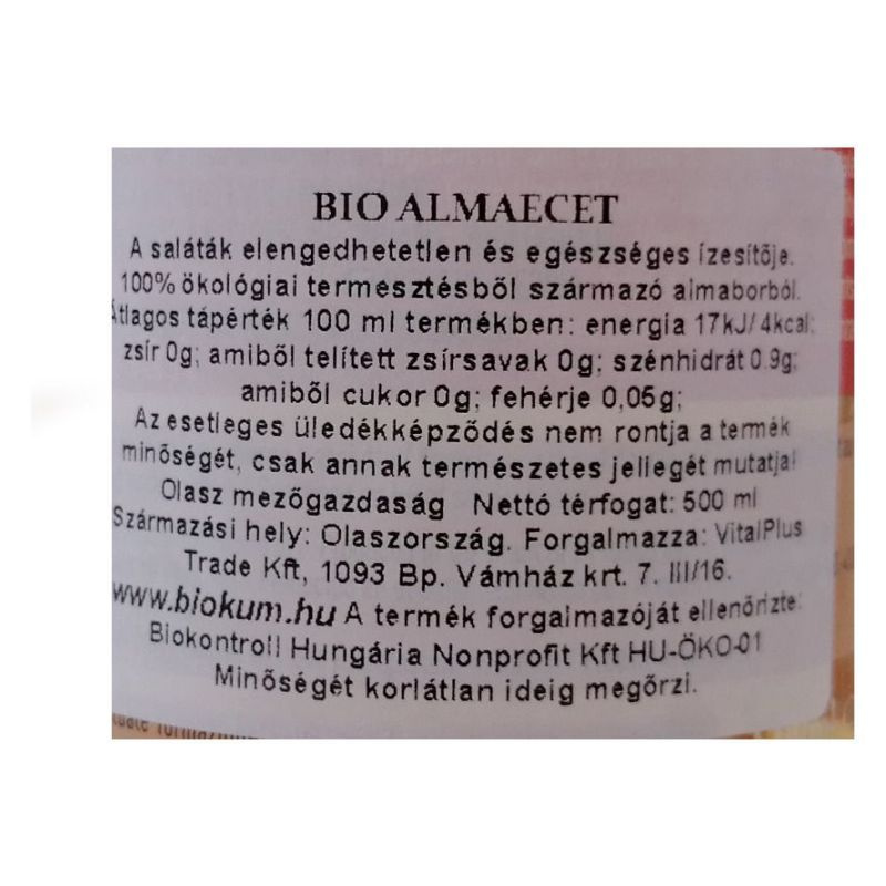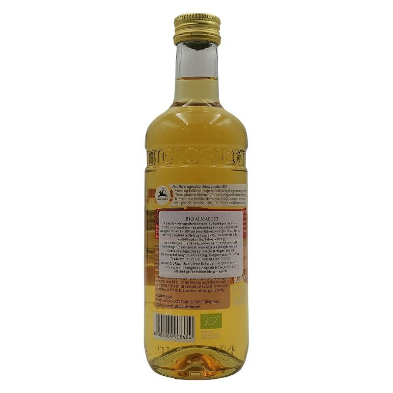 A saláták elengedhetetlen és egészséges ízesítője. Teljes savtartalom: 5%. Az alapanyagok kiváló minőségének köszönhetően, rendkívül ízletes almaecetet állítanak elő. Mivel az almaecet savtartalma alacsonyabb, mint a boreceté, tökéletes alapanyag salátákhoz és egyéb ételek elkészítéséhez. Az Alce Nero 1978 óta működtet bio gazdaságokat. Bio földművesek, termelők és méheszek fogtak össze, annak érdekében, hogy jó minőségű élelmiszereket állítsanak elő a termőföldet és a termelékenységét megóvó mezőgazdasági technológiák segítségével. Kizárólag bio terméket készítenek.