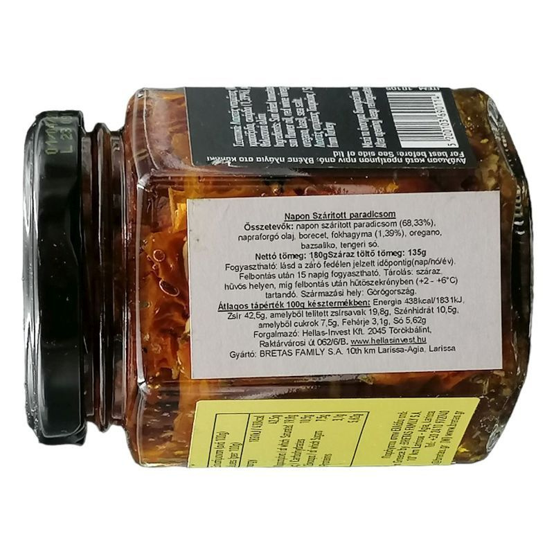 Összetevők: napszárított paradicsom (68,33%) napraforgó olaj, borecet, fokhagyma (1,39%) oregano, bazsalikom, tengeri só.