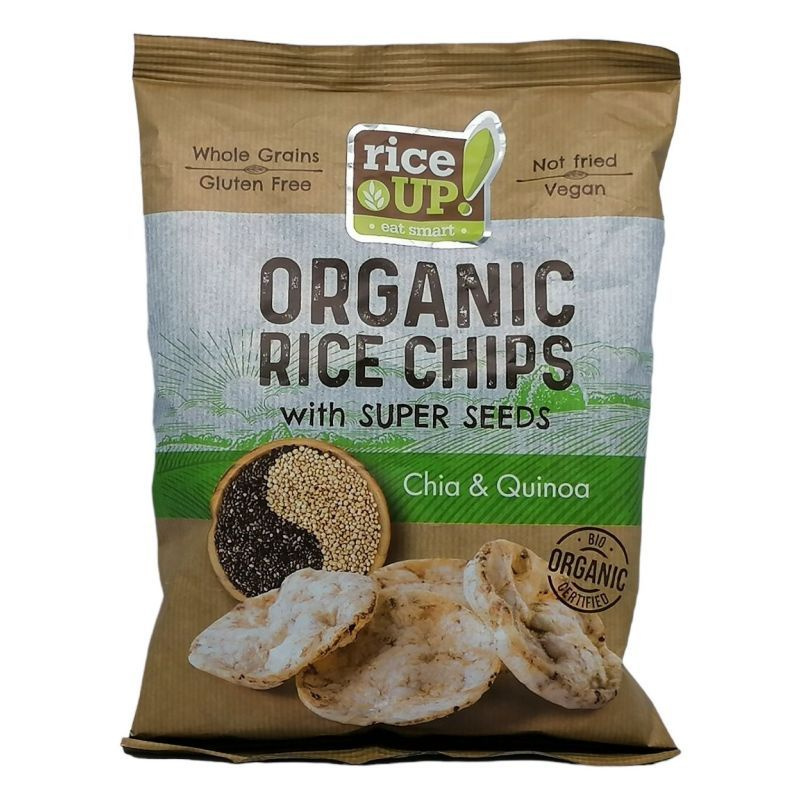 Bio, teljes kiőrlésű barna rizs chips chia maggal és quinoával.