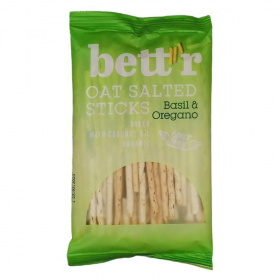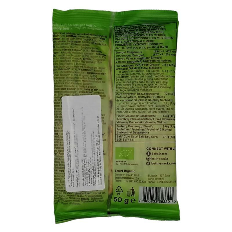 Összetevők: Zabliszt* 43%, búzaliszt*, kókuszolaj*, búzakovász*, tengeri só, bazalikom, oregano. *összetevők biogazdálkodásból