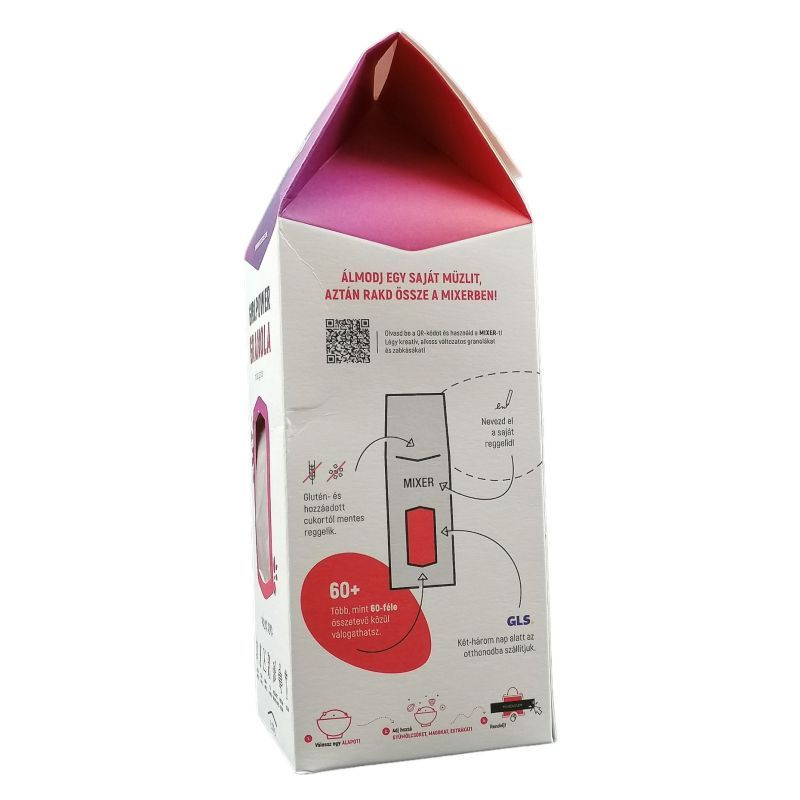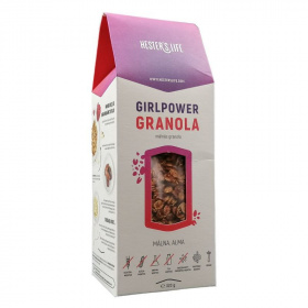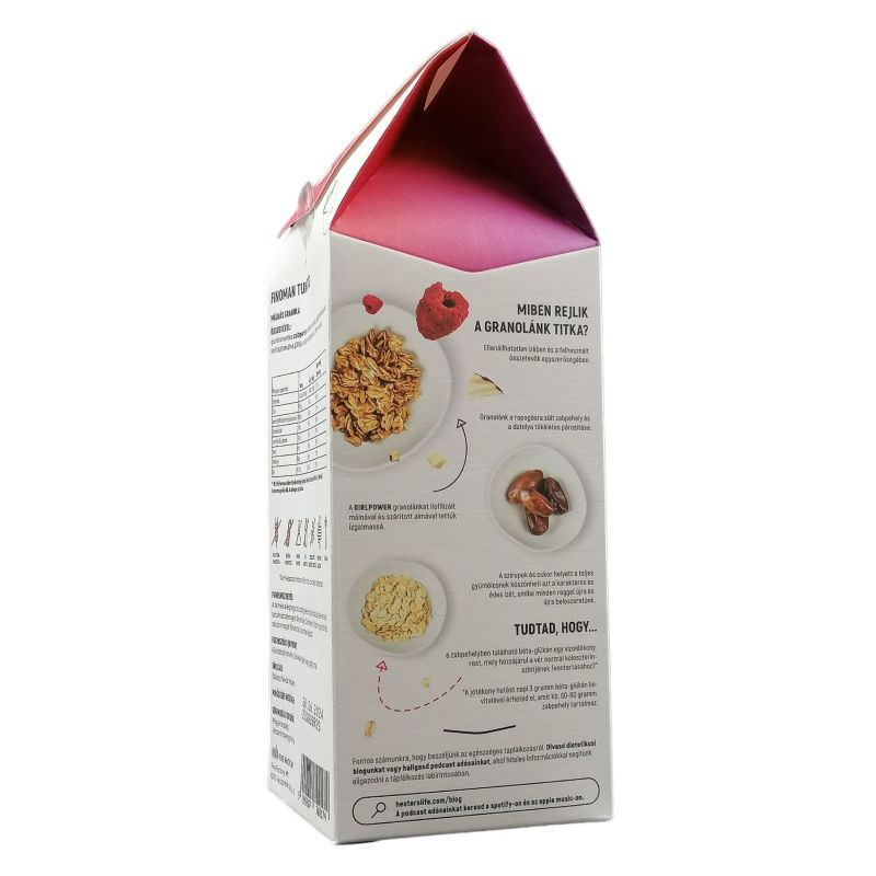 A Hester’s Life dietetikusa gluténmentes zabból, hozzáadott cukor nélkül, természetes alapanyagokból gondolta újra a granola fogalmát. A girlpower granolát üde málna és ropogós almakockák teszik elképesztően finommá, íze egyszerre fanyar és édes. Glutén-, szója-, tej-, színezékmentes. A termék vegán étrendbe beilleszthető. Élelmi rostban gazdag!
