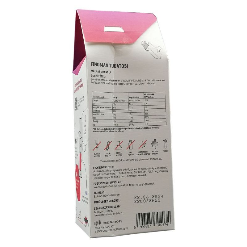 Összetétel: gluténmentes zabpehely, datolya, szárított alma (alma, étkezési sav: citromsav, kén-dioxid) liofilizált málna (3%) olívaolaj, fahéj, tengeri só, vanília.