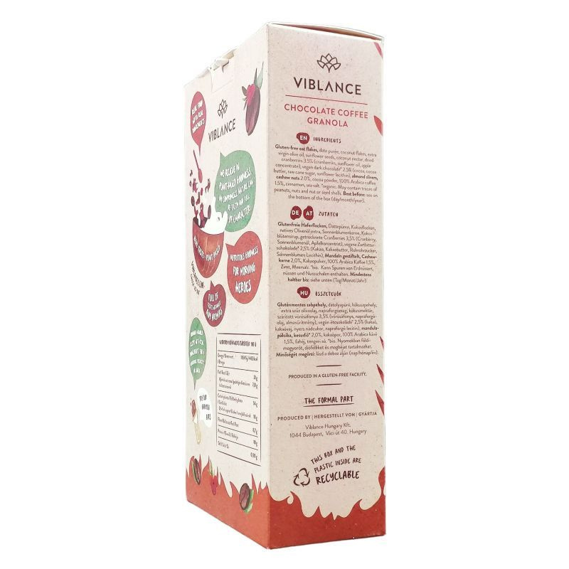 Összetevők: gluténmentes zabpehely, datolyanektár, kókuszpehely, extraszűz olívaolaj, napraforgómag, kókusznektár, szárított vörösáfonya 4% (vörösáfonya, napraforgóolaj, almasűrítmény) mandula, kesudió 3%, étcsokoládé 3% (kakaó, kakaóvaj, nyers nádcukor, napraforgó lecitin) kakaópor, kávé 2%, puffasztott köles, fahéj, tengeri só.
