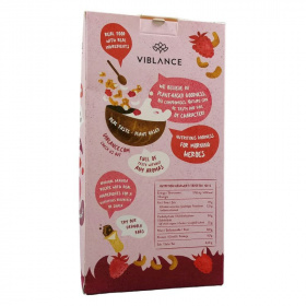 A granola gluténmentes zabpehelyből, málnából és kesudióból készül, rostban és antioxidánsokban gazdag.