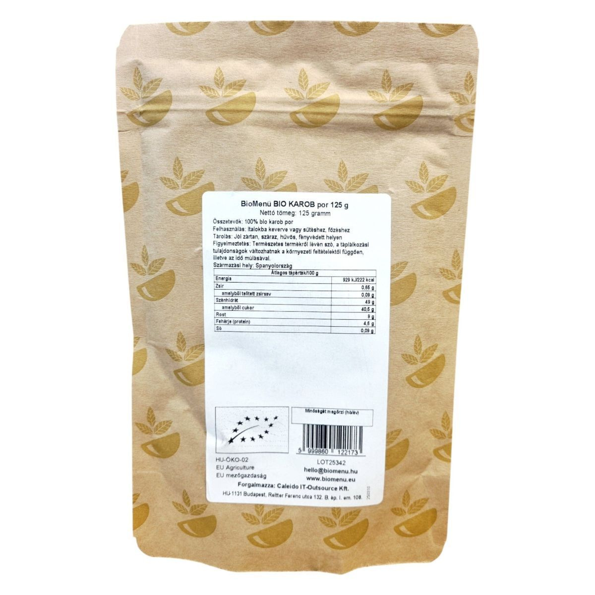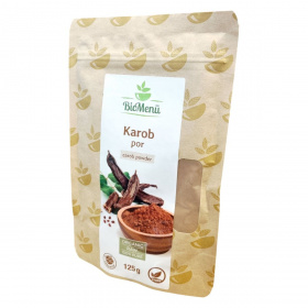 A BioMenü BIO KAROB por egy 100% tiszta, organikus és vegán termék, amely Spanyolországból származik. A karob por kiválóan használható italokba keverve, valamint sütéshez és főzéshez is. A termék energia- és tápértéke 100 grammonként 929 kJ/222 kcal, 0,65 g zsír, 49 g szénhidrát, 9 g rost, 4,6 g fehérje és 0,09 g só. A termék tárolása jól zártan, száraz, hűvös és fényvédett helyen ajánlott. A termék természetes jellege miatt a táplálkozási tulajdonságok változhatnak a környezeti feltételektől függően. Az engedélyszám HU-ÖKO-02, és a forgalmazó a Caleido IT-Outsource Kft.