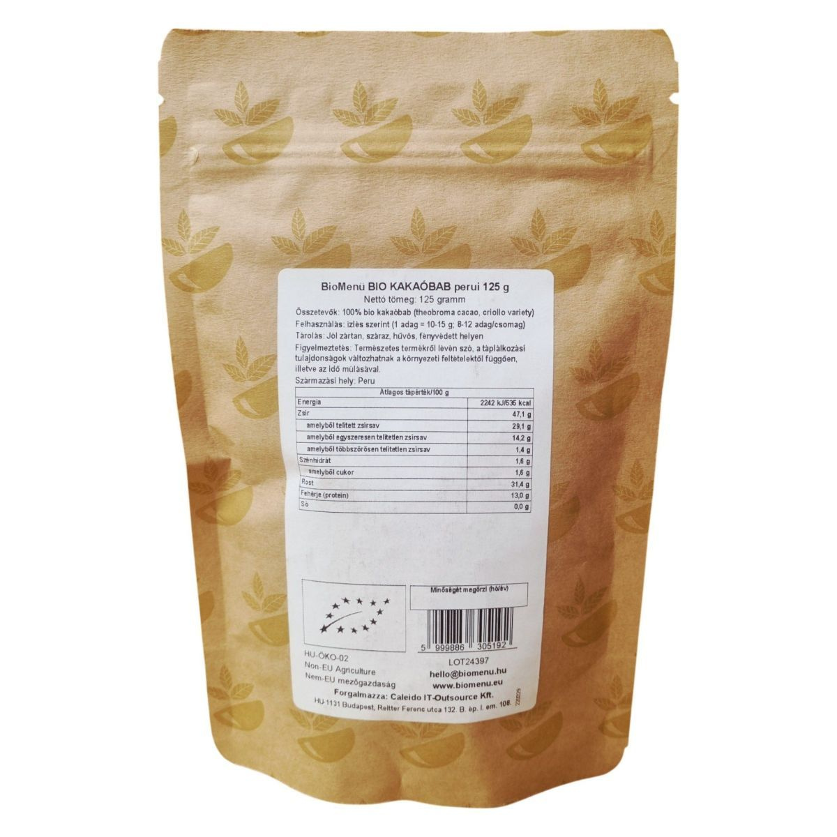 A BioMenü BIO KAKAÓBAB perui 125 g egy prémium minőségű, 100% bio kakaóbab termék, amely a híres criollo fajtából származik. A termék Peruból származik, és a Bio Garancia tanúsítvánnyal rendelkezik. A kakaóbab gazdag tápanyagokban, beleértve a zsírokat, rostokat és fehérjéket, miközben alacsony cukortartalommal bír. A termék ideális választás azok számára, akik természetes és tiszta kakaó ízélményre vágynak, és megfelel a bio és vegán étrendi irányzatoknak. A terméket jól zártan, száraz, hűvös, fényvédett helyen ajánlott tárolni, hogy megőrizze minőségét. A forgalmazó a Caleido IT-Outsource Kft., amely Budapesten található.