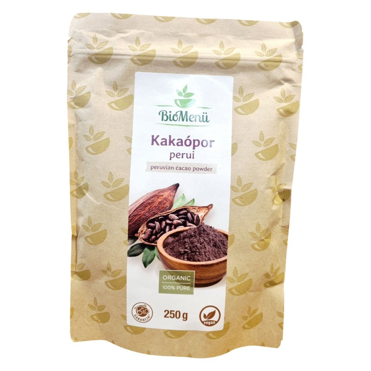A BioMenu BIO KAKÁÓPOR egy 100% tiszta, organikus perui kakaópor, amelyet bio és vegán étrendhez ajánlanak. A termék 250 grammos kiszerelésben kapható, és 100% bio kakaóbabból készül. A felhasználás ízlés szerint történik, egy adag 10-15 gramm, így egy csomag 16-25 adagot tartalmaz. A terméket jól zártan, száraz, hűvös, fényvédett helyen kell tárolni. A táplálkozási tulajdonságok természetes termékként változhatnak a környezeti feltételektől függően. A termék energia- és tápértéke 100 grammonként 1533 kJ/366 kcal, 11,0 g zsír, 26,8 g szénhidrát, 24,3 g rost és 28,0 g fehérje. A termék HU-ÖKO-02 engedéllyel rendelkezik, és a Caleido IT-Outsource Kft. forgalmazza.