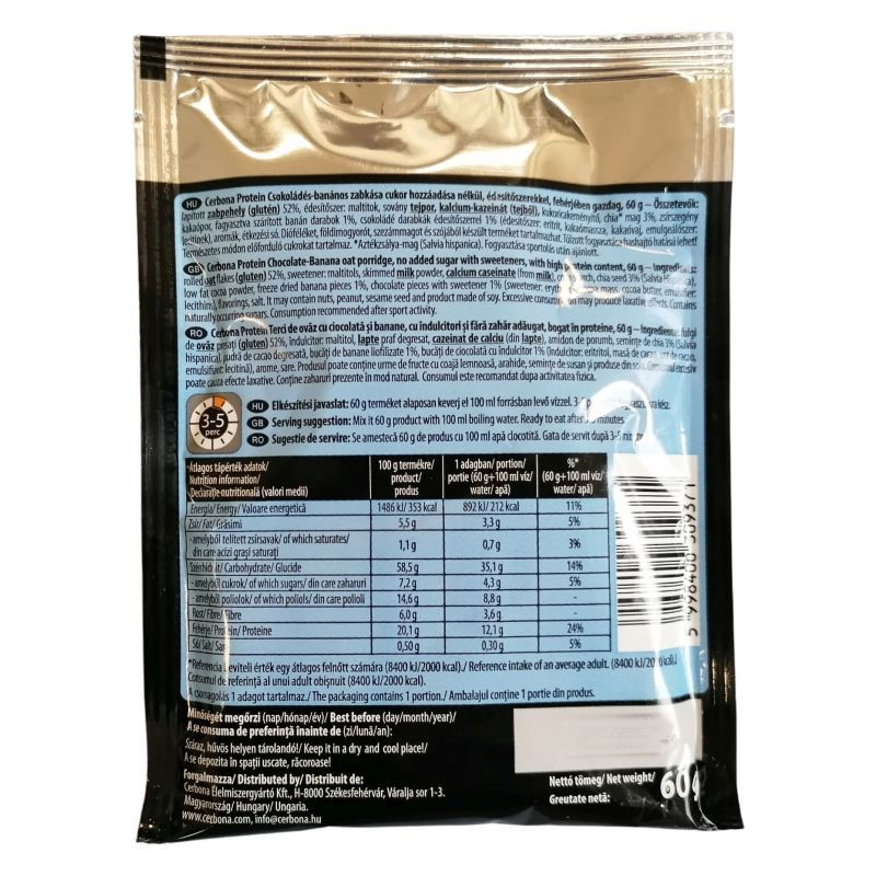 Összetevők: lapított zabpehely (glutén), édesítőszer: maltitok, sovány tejpor,kalcium-kazeinát, kukoricakeményítő, chia mag, zsírszegény kakaópor, fagyasztva szárított banán darabok 1%, csokoládé darabkák édesítőszerrel 1% (édesítőszer: eritrit, kakaómassza, kakaóvaj, emulgeálószer: lecitinek), aromák, étkezési só.