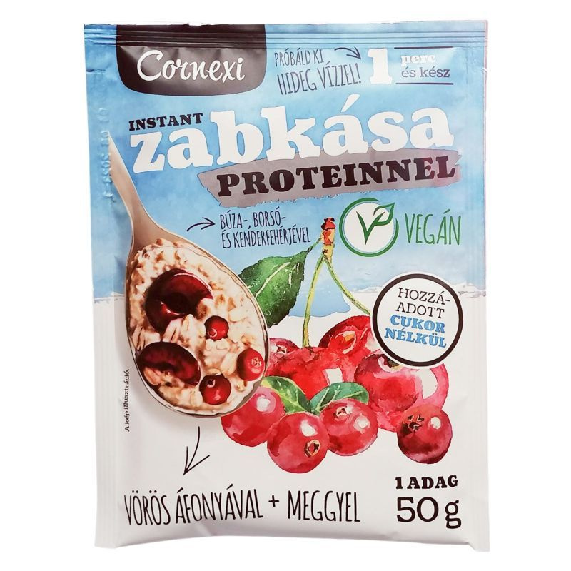Összetétele: zabpehely 59%, búzafehérje, oligofruktóz, kukoricakeményítő, kókusztejpor, ízfokozó (glicin), borsófehérje, liofilizált meggydarabok 1,5%, aszalt vörös áfonya apríték 1,5% (vörös áfonya, ananászlé, rizsliszt, növényi olaj (napraforgó)), kenderfehérje, aromák, étkezési sav (citromsav), étkezési só.
