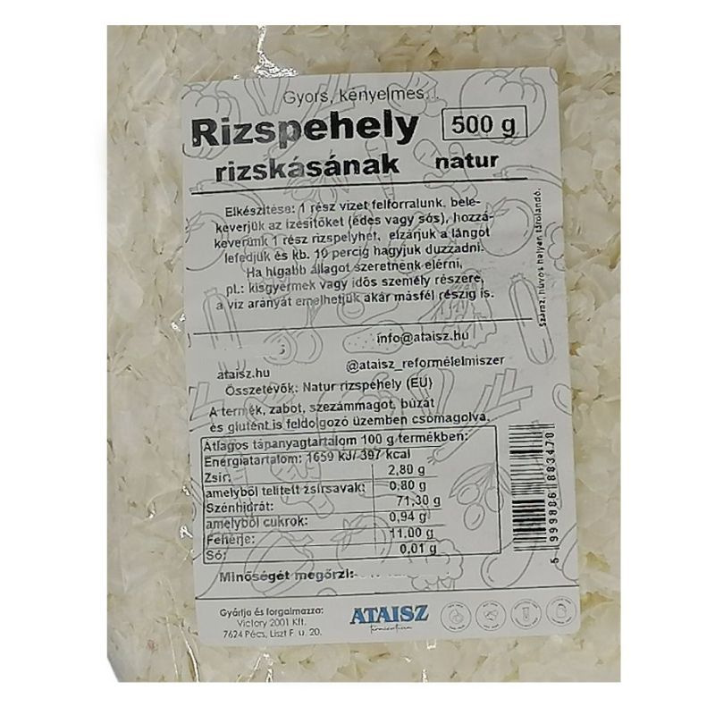 Natúr pelyhesített rizs. Elkészítése: 3 rész vizet felforralunk, belekeverjük az ízesítőket (édes vagy sós) hozzákeverünk 1 rész rizspelyhet, elzárjuk a lángot lefedjük és kb. 10 percig hagyjuk duzzadni. Allergén információ: a termék, zabot, szezámmagot, zellert, búzát és glutént is feldolgozó üzemben készült.