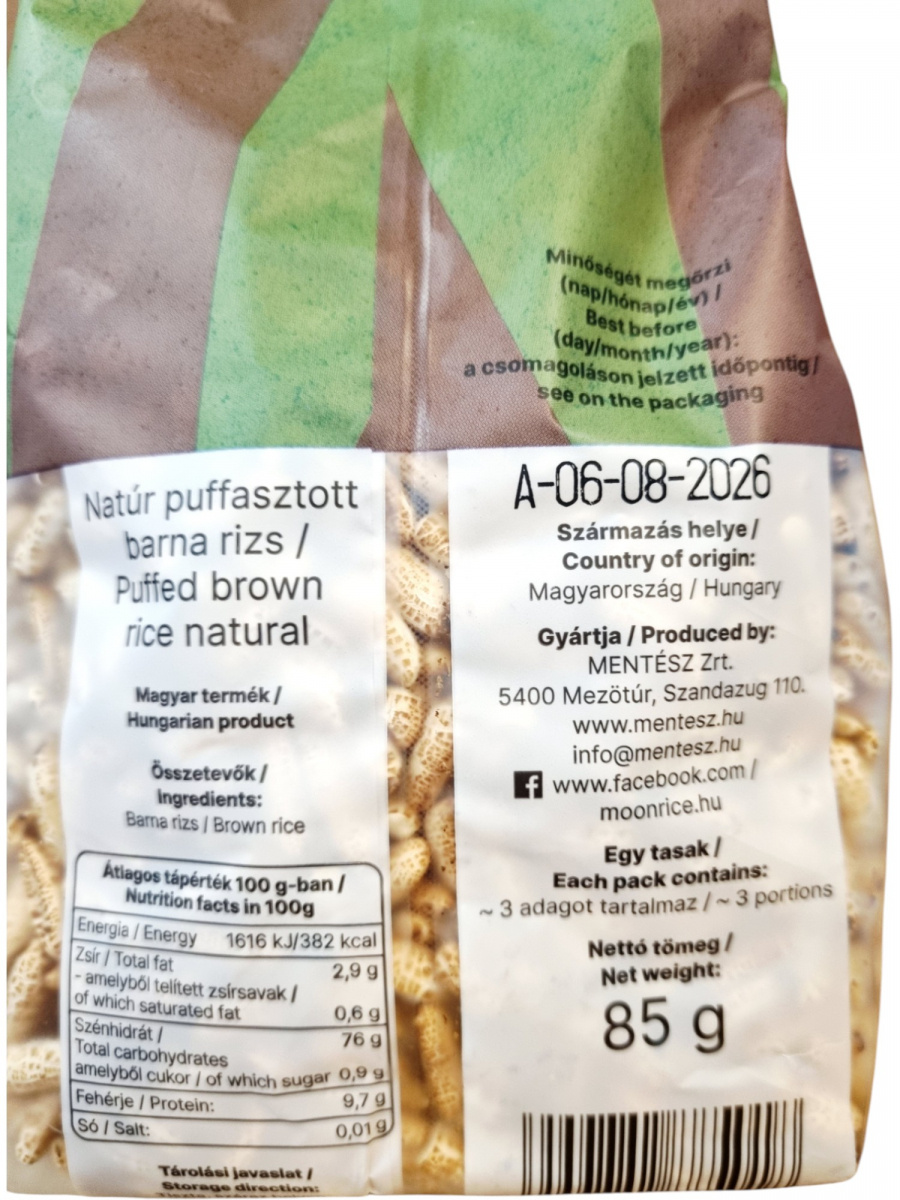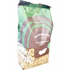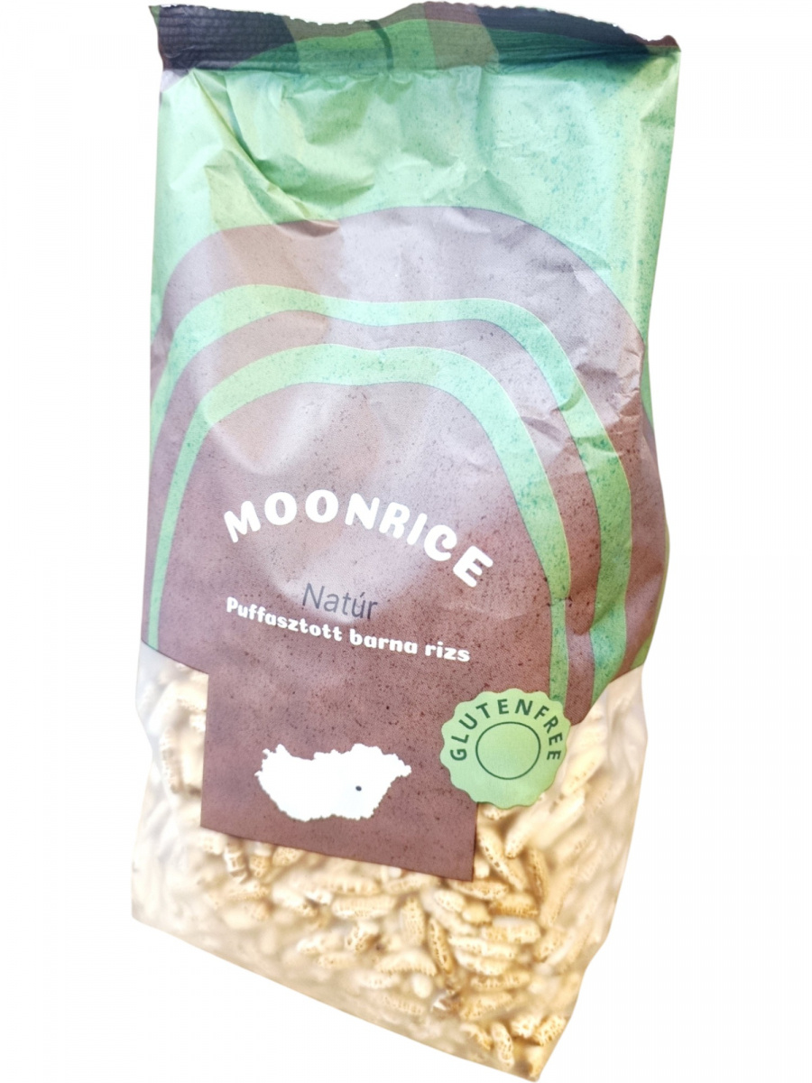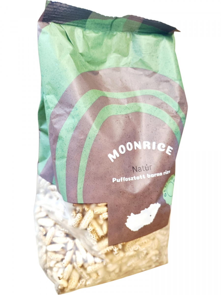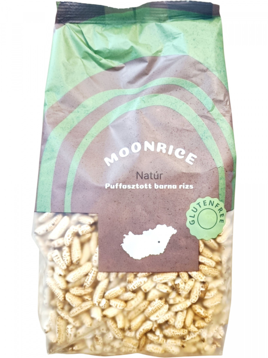 A Moonrice natúr puffasztott barna rizs magyar termék, amely 85 g-os kiszerelésben kerül forgalomba, körülbelül 3 adag tartalommal. A barna rizs puffasztott formában megőrzi a gabona teljes értékű tápanyagtartalmát, így magasabb rost- és ásványianyag-tartalommal rendelkezik, mint a fehér rizs változat. Könnyű és ropogós szerkezete miatt önmagában is fogyasztható, de kiegészítőként is jól illeszkedik különböző ételekhez és nassolnivalókhoz. A termék gluténmentes, ezért érzékenyek számára is megfelelő választás.