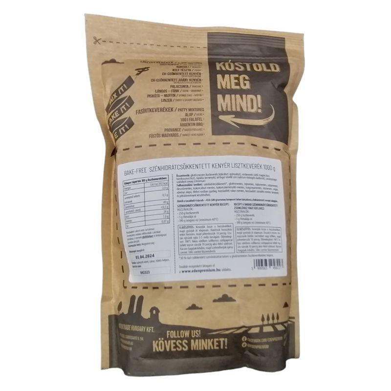 250 g Bake-Free szénhidrátcsökkentett kenyér lisztkeverék, 5 g Eden Premium Himalája, vagy Eden Premium Parajdi só, 390 g langyos víz (körülbelül 40 fokos). Keverjük össze a hozzávalókat, majd gyúrjuk át alaposan. Formázzunk belőle veknit, majd pihentessük 15 percig. Ezután érdemes 2-3 bevágást ejteni rajta. Előmelegített 190 fokos sütőben szilikonos sütőpapírral bélelt tepsin süssük 70 percig alsó-felső sütéssel. Rácson hagyjuk kihűlni, majd szeleteljük igény szerint. Ízlés szerint fűszerezhető.