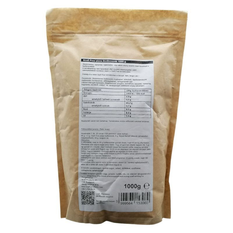 Gluténmentes pizza lisztkeverék, amelyből olaj nélkül is vékony pizzatészta készíthető. A termék állati eredetű összetevőket nem tartalmaz, a Szafi Free termékcsalád része, olaszos fűszerezéssel.