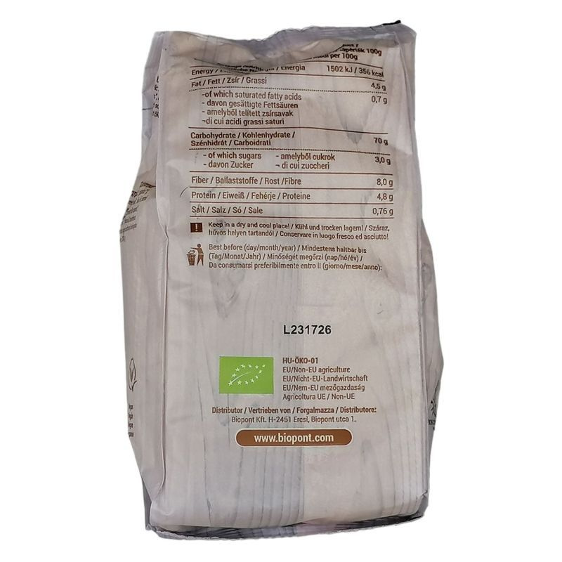 Összetevők: kukoricadara*, keményítő* (kukorica*, burgonya*), liszt* (rizs*, kukorica*, köles*), rizsszirup*, napraforgóolaj*, tengeri só, nádcukor*, útifűmaghéj*, emulgeálószer (napraforgólecitin), szárított élesztő, térfogatnövelő szerek (nátrium-hidrogén-karbonát, ammónium-hidrogén-karbonát), savanyúságot szabályozó anyag (nátrium-hidroxid). *Ellenőrzött ökológiai gazdálkodásból származó alkotó.