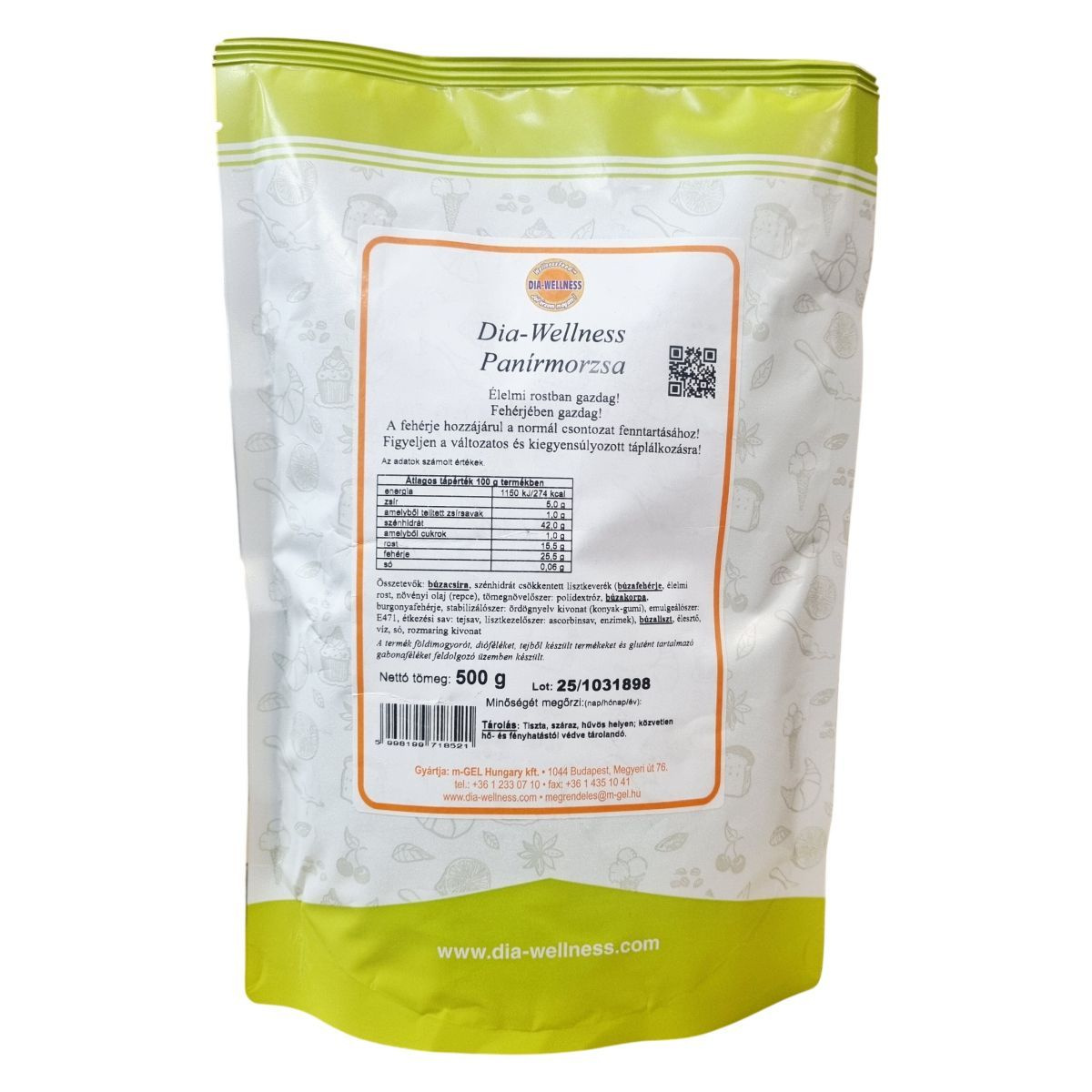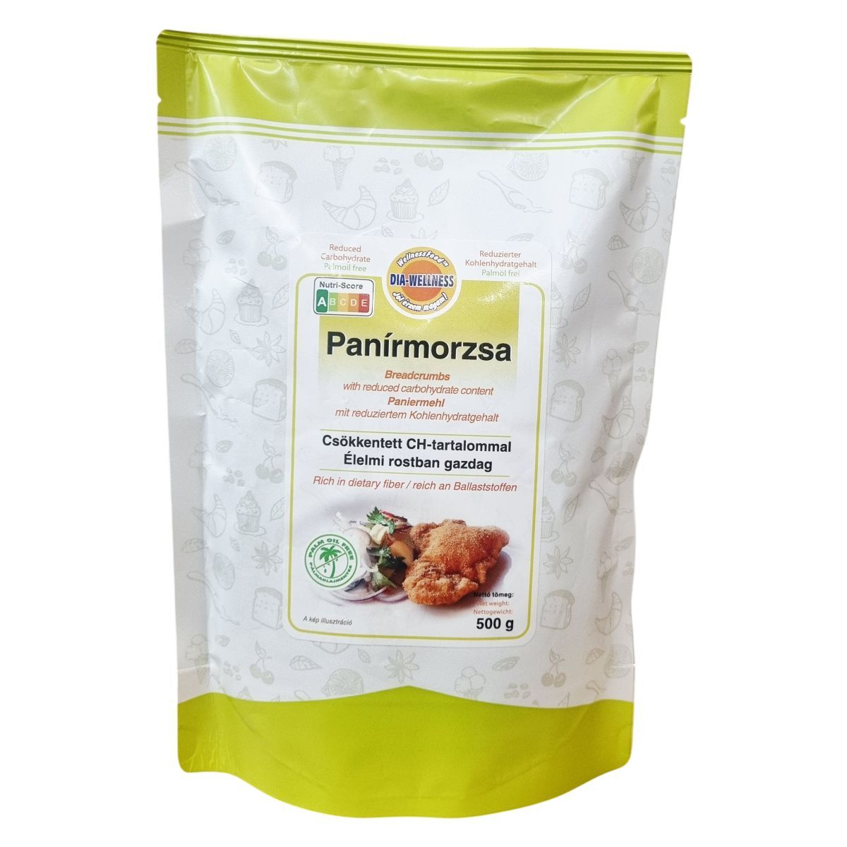 A Dia-Wellness Panírmorzsa csökkentett szénhidráttartalmú, élelmi rostban gazdag termék, amely hozzájárul a fehérjetartalmán keresztül a normál csontozat fenntartásához. A termék pálmaolajmentes, és részben búzafehérjéből, növényi olajból, polidextrózból, búzalisztből, élesztőből és rozmaring kivonatból áll. Az adatok számolt értékek, a termék egyaránt alkalmas változatos és kiegyensúlyozott táplálkozás részeként. A panírmorzsa előállítása során földimogyorót, dióféléket, tejtermékeket és glutént tartalmazó gabonákat is feldolgozó üzemet alkalmaznak, ezért ezen allergének előfordulhatnak. A termék nettó tömege 500 g, és átfogó Nutri-Score besorolással rendelkezik, kiemelve a csökkentett szénhidráttartalmat és a pálmaolajmentességet. A csomagoláson jelzett, hogy a kép illusztrációként szolgál.