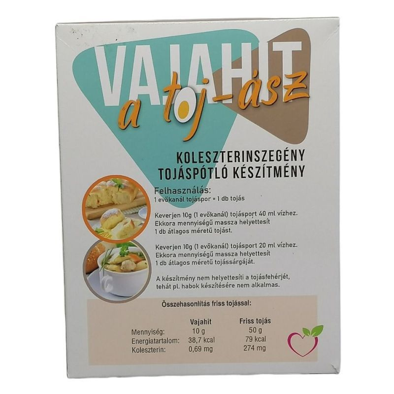 A doboz tartalma 20 tojás pótlásához elegendő. Felhasználás: 1 evőkanál tojáshelyettesítőpor = 1 db tojás. Keverjen 10 g (1 evőkanál) tojáshelyettesítőport 40 ml vízhez. Ekkora mennyiségű massza helyettesít 1 db átlagos méretű tojást. Keverjen 10 g (1 evőkanál) tojáshelyettesítőport 20 ml vízhez. Ekkora mennyiségű massza helyettesít 1 db átlagos méretű tojás sárgájátt. A készítmény nem helyettesíti a tojásfehérjét, tehát pl. Habok készítésére nem alkalmas.