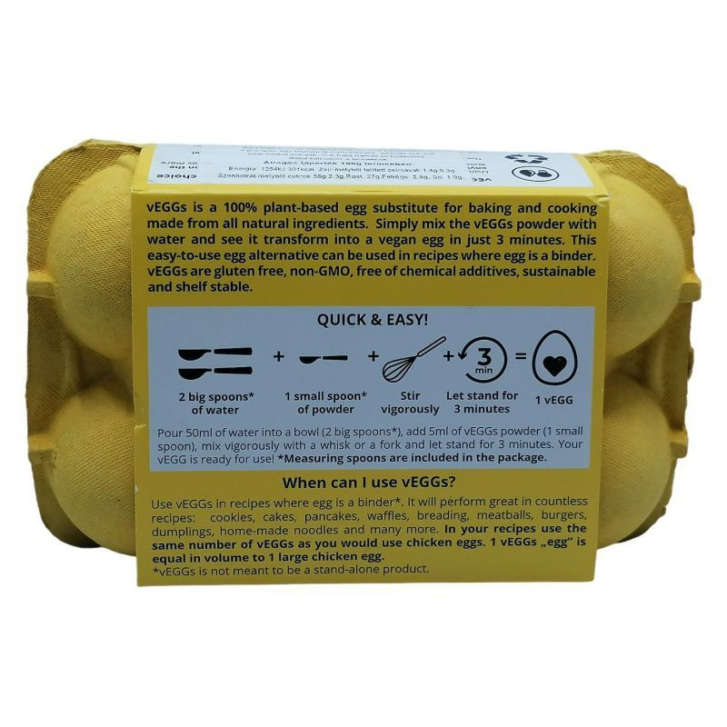 Használjon veeg-eket olyan receptekben, ahol a tojás kötőanyag*. *= a veegs nem önálló termék. Számtalan receptben remekül fog teljesíteni: sütik, sütemények, palacsinták, gofri, panírozás, húsgombóc, hamburgerek, galuskák, házi tészták és még sok más. Receptjeiben ugyanannyi veeg-t használjon, mint csirketojást. 1 veegs "tojás" térfogata megegyezik 1 nagy csirke tojással. Elkészítési javaslat: egyszerűen keverje össze a veggs port vízzel és nézze meg, hogyan alakul vegán tojássá mindössze 3 perc alatt! A tasakban található 2 nagy kanál víz + 1 kis kanál tojáspor = kézi habverővel keverje csomómentesre és hagyja pihenni 3 percig = így készül 1 db tyúk tojásnak megfelelő veggs "tojás".