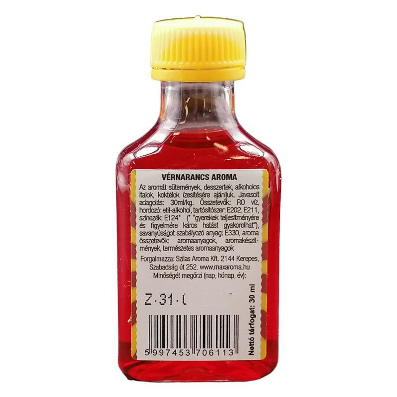 Vérnarancs aroma használatával készíthetünk tökből vagy cukkíniből "narancs dzsemet ", vagy lekvárt is. A vérnarancs aroma használható továbbá koktélok, kompótok, fagylaltok, és egyéb desszertek ízesítésére, valamint likőr készítésére is. Színezéket tartalmaz. Minőségét megőrzi: 24 hónap. Desztillált vízben és etilalkoholban oldott aromaanyag. Mesterséges színezékek: E-124 (kedvezőtlen hatással lehet a gyermekek figyelmére és teljesítményére). Tartósítószer: E-202, E-211. Adagolás: 30 ml/l (kg).