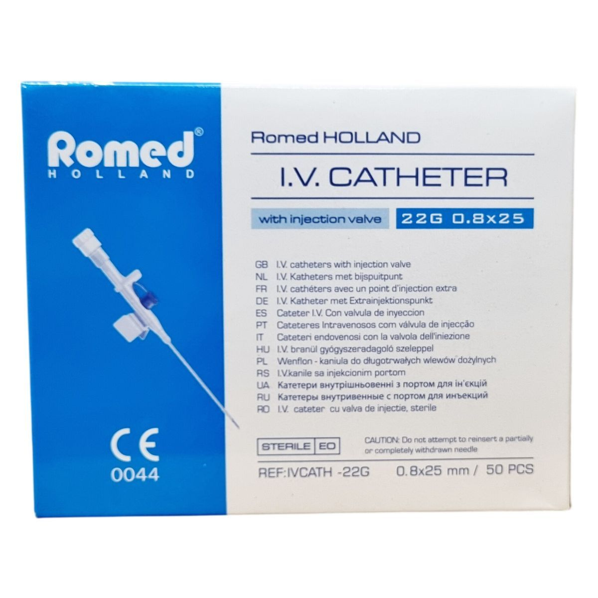 A Romed HOLLAND I.V. katéter injekciós szeleppel 22G méretben készült, 0.8 mm átmérővel és 25 mm hosszúsággal. A termék steril, etilén-oxiddal sterilizált, és kizárólag klinikai használatra alkalmas. A katéter az EN-10555-5 szabványnak megfelel, és többszörösen bevizsgált. Többféle méretben és színkódokkal elérhető, melyek az adott átmérőt és hosszúságot jelzik. A termék kizárólag egyszeri használatra készült, nem újra sterilizálható vagy használható vissza, a fertőzésveszély minimalizálása érdekében. A termék csomagolása 50 darabot tartalmaz, és megfelel az európai minőségi és biztonsági előírásoknak.