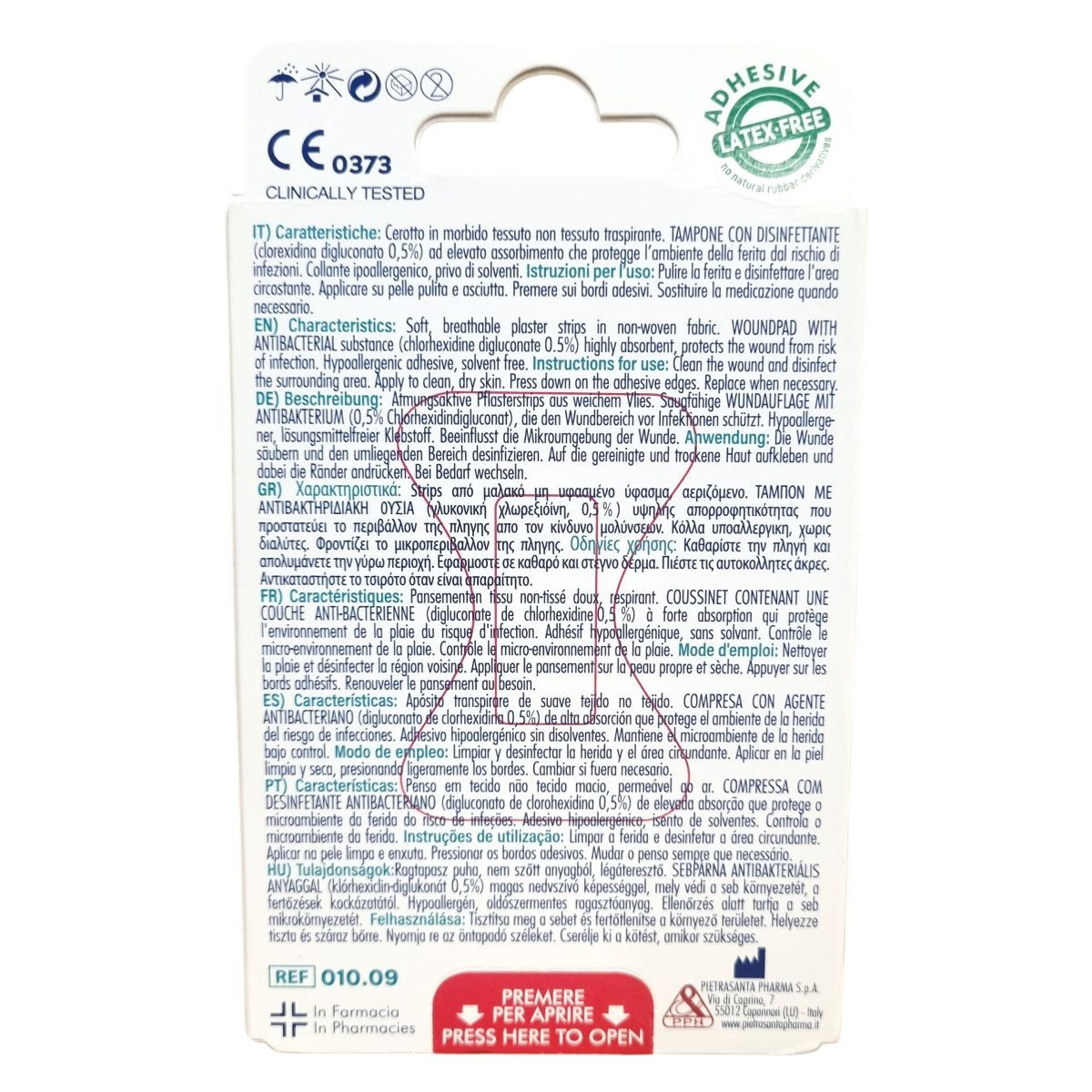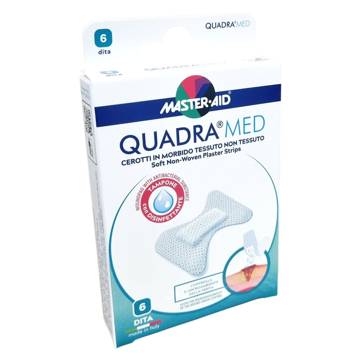 A Quadra®Med Master·Aid a professzionális sebkezeléshez készült ragtapasz-párna, amely puha, légáteresztő, nem szőtt textilből áll. A sebpárna klórhexidin-diglukonát 0,5% antibakteriális anyagot tartalmaz, amely magas nedvszívó képességgel rendelkezik, így hatékonyan védi a sebet a fertőzésektől. A tapasz ragasztóanyaga oldószermentes és hypoallergén, minimalizálva az irritáció kockázatát. Az eszköz klinikailag tesztelt, alkalmas az egészségügyi ellátás fontos eszközeként a seb mikro-környezetének kontrollálására. Használatához a seb és környezete alapos tisztítása, fertőtlenítése szükséges, az alkalmazás tiszta és száraz bőrre történik, a ragasztó szélét jól le kell nyomni. A kötést szükség szerint cserélni kell a megfelelő sebgyógyulás biztosítása érdekében. A termék hat darabos kiszerelésben, olasz gyártásban érhető el.