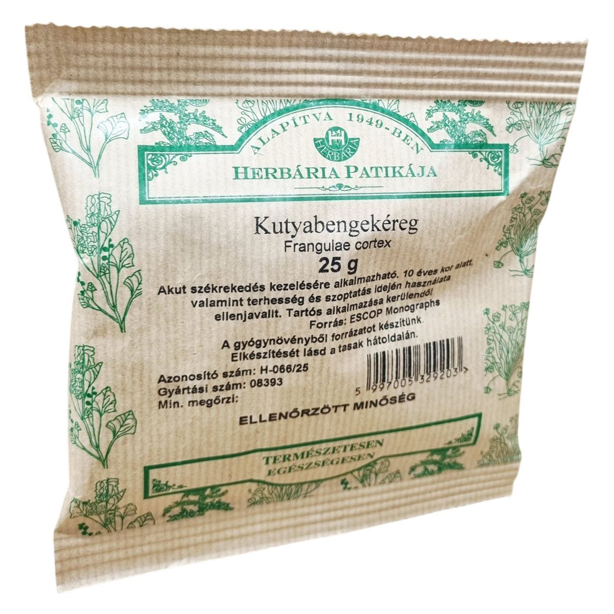 A Kutyabengekéreg (Frangulae cortex) az akut székrekedés kezelésére alkalmazható gyógynövény. A gyógyteák elkészítésének különböző módjait ismerteti a termék, így forrázattal, főzettel vagy hideg vizes kivonattal. A forrázat készítése lágy, puha állományú növényi részekből történik, amikor a gyógynövényt forrásban lévő vízzel leöntik és lefedve állni hagyják, majd leszűrik. A termék az ESCOP Monographs által ellenőrzött minőségben kerül forgalomba. Azonosító szám és gyártási szám is megtalálható a csomagoláson.