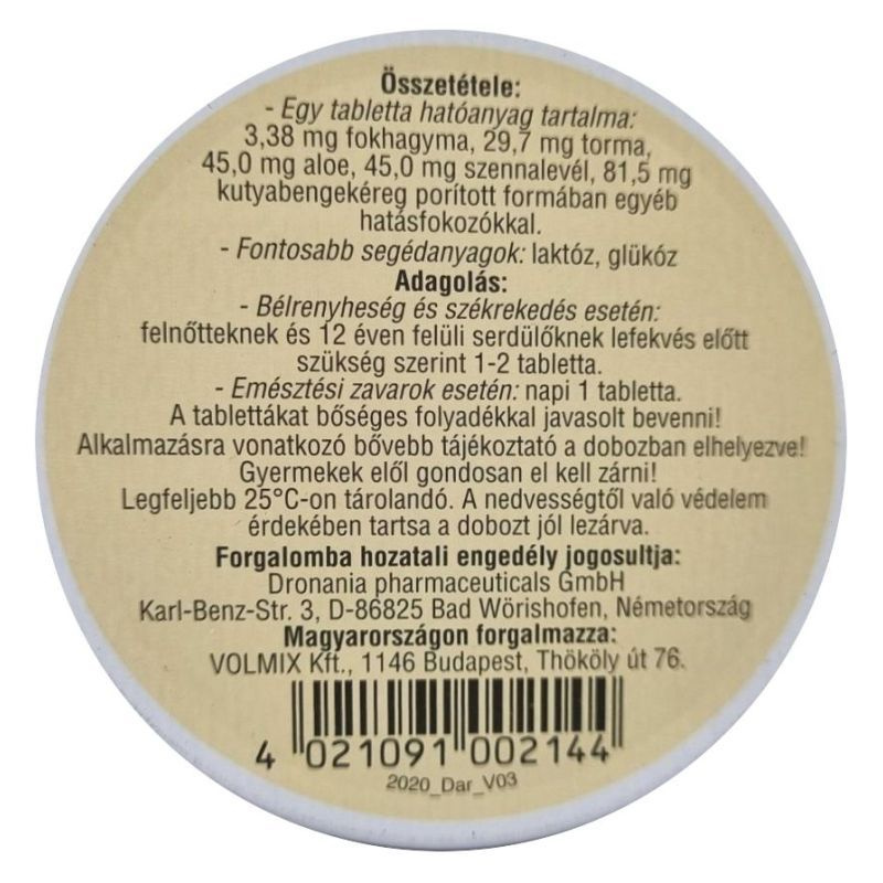 A tabletta emésztést elősegítő, enyhe hashajtó hatású gyógyszernek nem minősülő gyógyhatású készítmény.