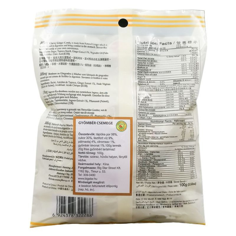 Hasmenés ellen is jó, valamint kitűnő görcsoldó, legyen szó bél vagy menstruációs görcsről. Nagyon jó memóriajavító, kiélesíti az érzékeket. A gyömbér nemcsak a testet, a lelket is erősíti. Fokozza az intelligenciát, határozottabbá tesz. A Gyömbér csemege kitűnő téli megázásos időszakban. Összetevők: Tápióka por 56%, Cukor 30%, Tisztított víz 9%, Pálmaolaj 4%, Gyömbér kivonat 1%.100g termék 20g friss gyömbért tartalmaz!