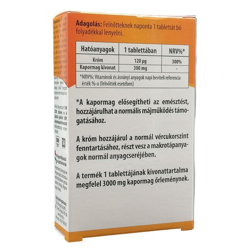 A króm hozzájárul a normál vércukorszint fenntartásához, részt vesz a makrotápanyagok normál anyagcseréjében. A termék 1 tablettájának kivonattartalma megfelel 3000 mg kapormag őrleménynek. Adagolás: naponta 1 tablettát bő folyadékkal lenyelni.