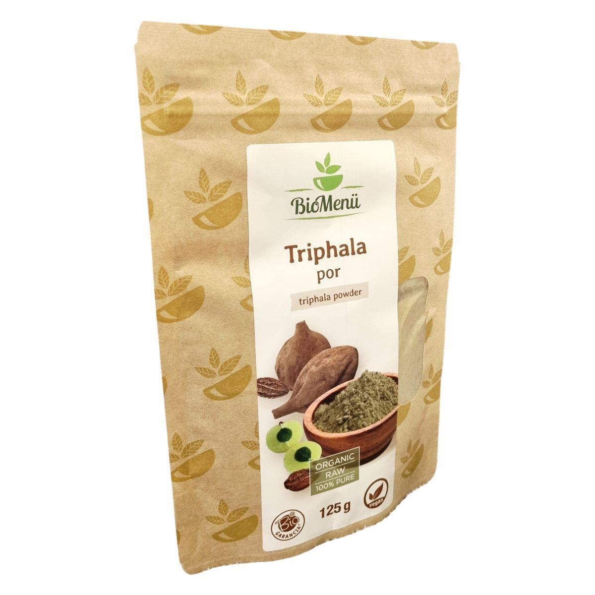 A BioMenü Triphala por egy 100%-ban bio, organikus eredetű, természetes alapanyagokból készült termék, mely amla, bibhitaki és haritaki gyümölcsök őrleményét tartalmazza. A por Indiából származik, és a csomagolás 125 gramm tiszta triphala port tartalmaz, ami 25-62 adagra elegendő. A termék nyomokban glutént és egyéb allergéneket tartalmazhat, ezért allergiásoknak javasolt körültekintően használni. Vegánok és különböző étkezési irányzatok követői számára is alkalmas. A termék fogyasztása javasolt meleg vízbe és mézbe keverve az adagolási útmutató szerint, ami napi egyszeri elkészítést jelent. A készítmény tárolása száraz, hűvös helyen, megfelelően zártan ajánlott, hogy megőrizze frissességét és tulajdonságait.