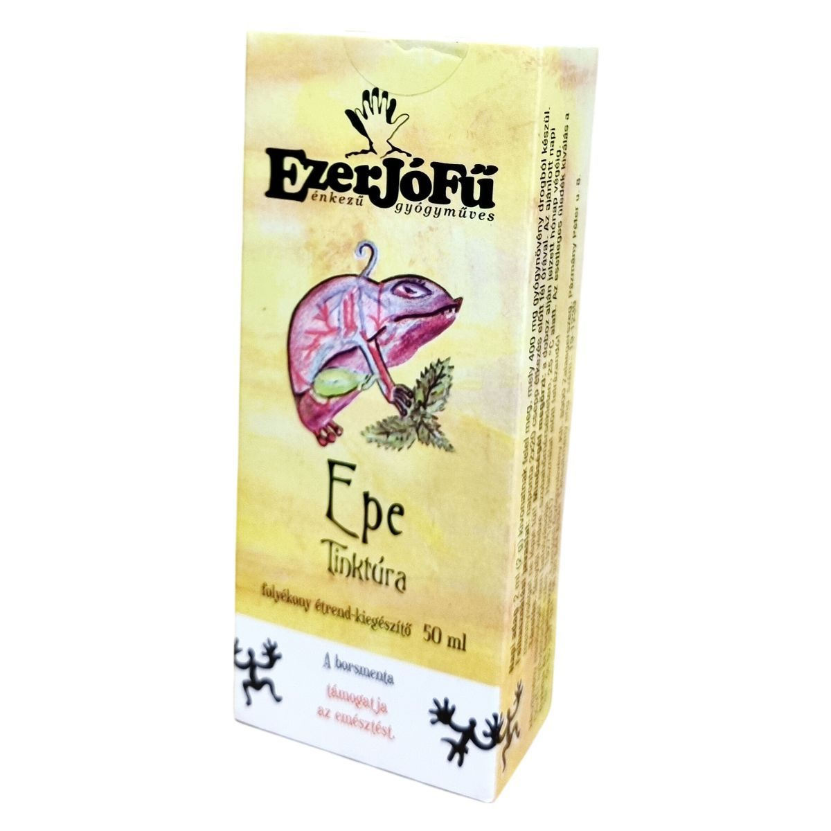 Az EzerJóFű Epe Tinktúra egy 50 ml-es folyékony étrend-kiegészítő, amely borsmentát és apróbojtorjánt tartalmaz, amelyek támogathatják az emésztést és elősegíthetik az epetermelést. A termék vizes-alkoholos gyógynövény kivonat, 36 V/V % alkoholtartalommal. Az ajánlott napi adag 2 ml, amely 400 mg gyógynövény drogokból készül. A termék használata előtt felrázandó, és fénytől védve, szobahőmérsékleten tárolandó. Az étrend-kiegészítő nem helyettesíti a kiegyensúlyozott vegyes étrendet és egészséges életmódot. Gyártja és forgalmazza az Ezerjófű Gyógynövény Kft., Zalaegerszegen.