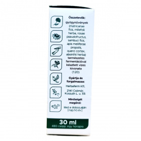 gyógynövények (matricariae flos, millefolii herba, rosae pseudofructus, sambuci flos, apis melliferae propolis, querci cortex, absinthii herba) természetes fermentációval készített vizes kivonata (1:20)