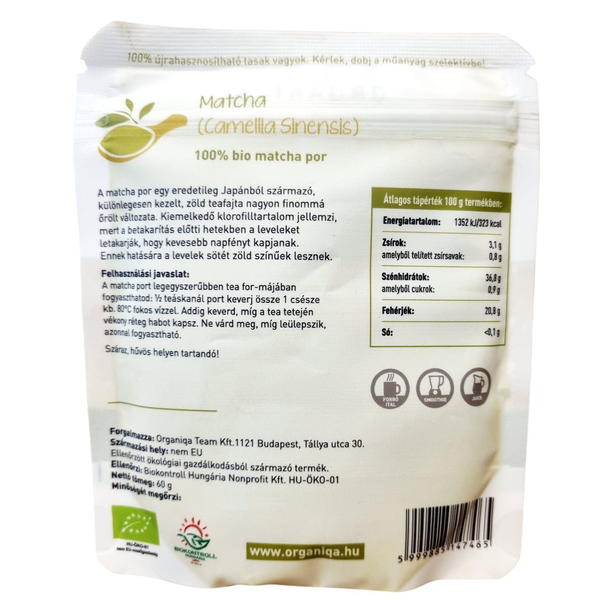 A matcha por egy különlegesen kezelt zöld teafajta, amely Japánból származik. A betakarítás előtti hetekben a leveleket letakarják, hogy kevesebb napfényt kapjanak, így a levelek sötét zöld színűek lesznek. A termék 100% bio minősítésű, és ellenőrzött ökológiai gazdálkodásból származik. A matcha port tea formájában lehet fogyasztani, de forró italok, smoothie-k és juice-ok készítéséhez is felhasználható. A csomagolás 100% újrahasznosítható, és a műanyag szelektív gyűjtőbe dobható.