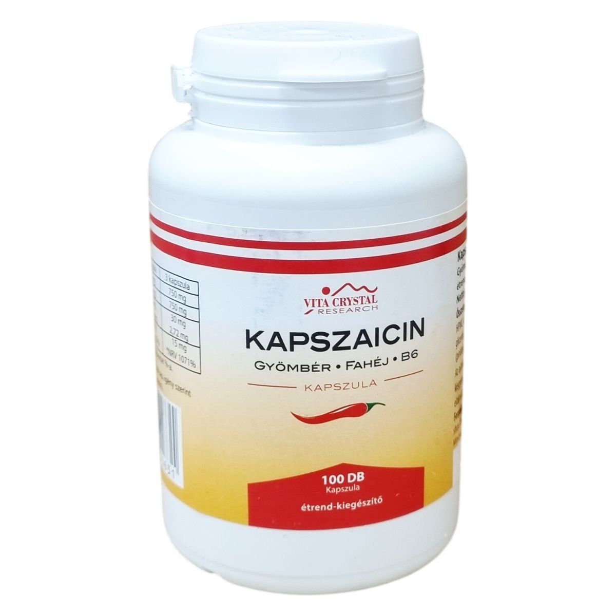 A VITA CRYSTAL kapszaicin kapszula gyömbérrel, fahéjjal és B6-vitaminnal kiegészített étrend-kiegészítő, amely kapszulás formában kerül forgalomba. A termék nettó tömege 63,5 g, azaz 100 darab 635 mg-os kapszula található a csomagban. A készítmény alapvető összetevői között szerepel a gyömbérgyökér por, fahéj por, valamint a Capsicum extract 10:1, mely a chili paprika kivonatát jelenti. A kapszula HPMC alapú, így vegetáriánusok számára is alkalmas lehet. A B6-vitamin szerepe kiegészítő jellegű a készítményben. A terméket kisgyermekektől elzárva kell tartani, és nem helyettesíti a változatos, kiegyensúlyozott étrendet és az egészséges életmódot.