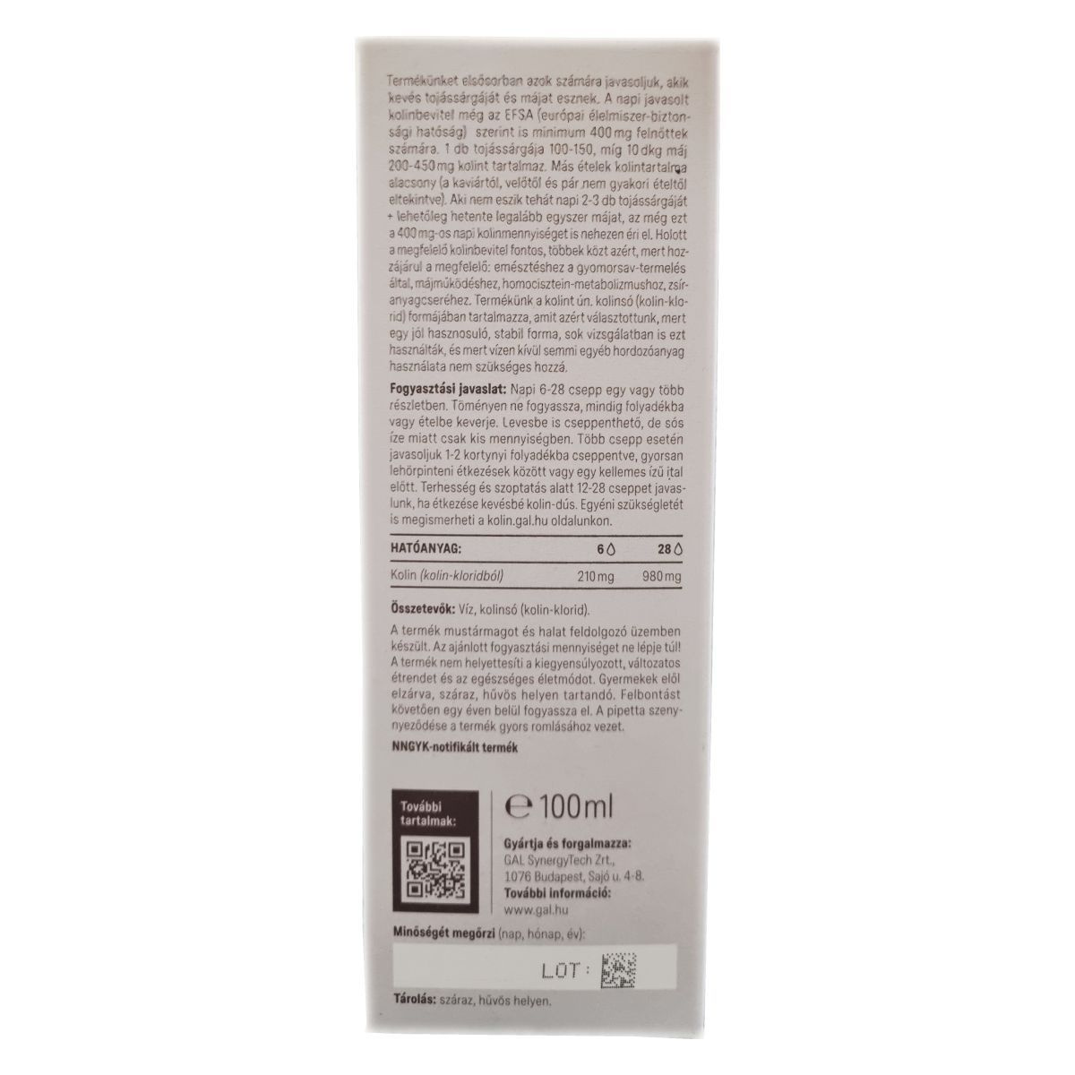 Termékünket elsősorban azok számára javasoljuk, akik kevés tojássárgáját és májat esznek. A napi javasolt kolinbevitel az EFSA szerint is minimum 400 mg felnőttek számára. 1 db tojássárgája 100–150, míg 10 dkg máj 200–450 mg kolint tartalmaz. Más ételek kolintartalma alacsony. A kolin ún. kolinsó (kolin-klorid) formájában található meg a termékben, ami jól hasznosuló, stabil forma, vízen kívül semmilyen más hordozóanyagot nem igényel. TÜV / ISO 9001:2015 tanúsított folyamatok előírásai szerint készült termék. ~366 adag, 100 ml.