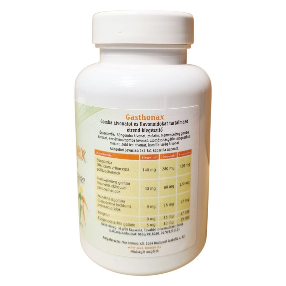 A Gasthonax étrend-kiegészítő különféle gomba kivonatokat és flavonoidokat tartalmaz, amelyek potenciálisan támogathatják az immunrendszert és az általános egészséget. A termék süngomba, hamvaskéreg gomba és pecsétviaszgomba poliszacharidokat tartalmaz, amelyek hozzájárulhatnak a szervezet természetes védekezőképességéhez. A zöld tea és kamilla virág kivonatok további jótékony hatásokat nyújthatnak. A termék 60 kapszulát tartalmaz, és a napi adagolás rugalmasan igazítható az egyéni igényekhez.
