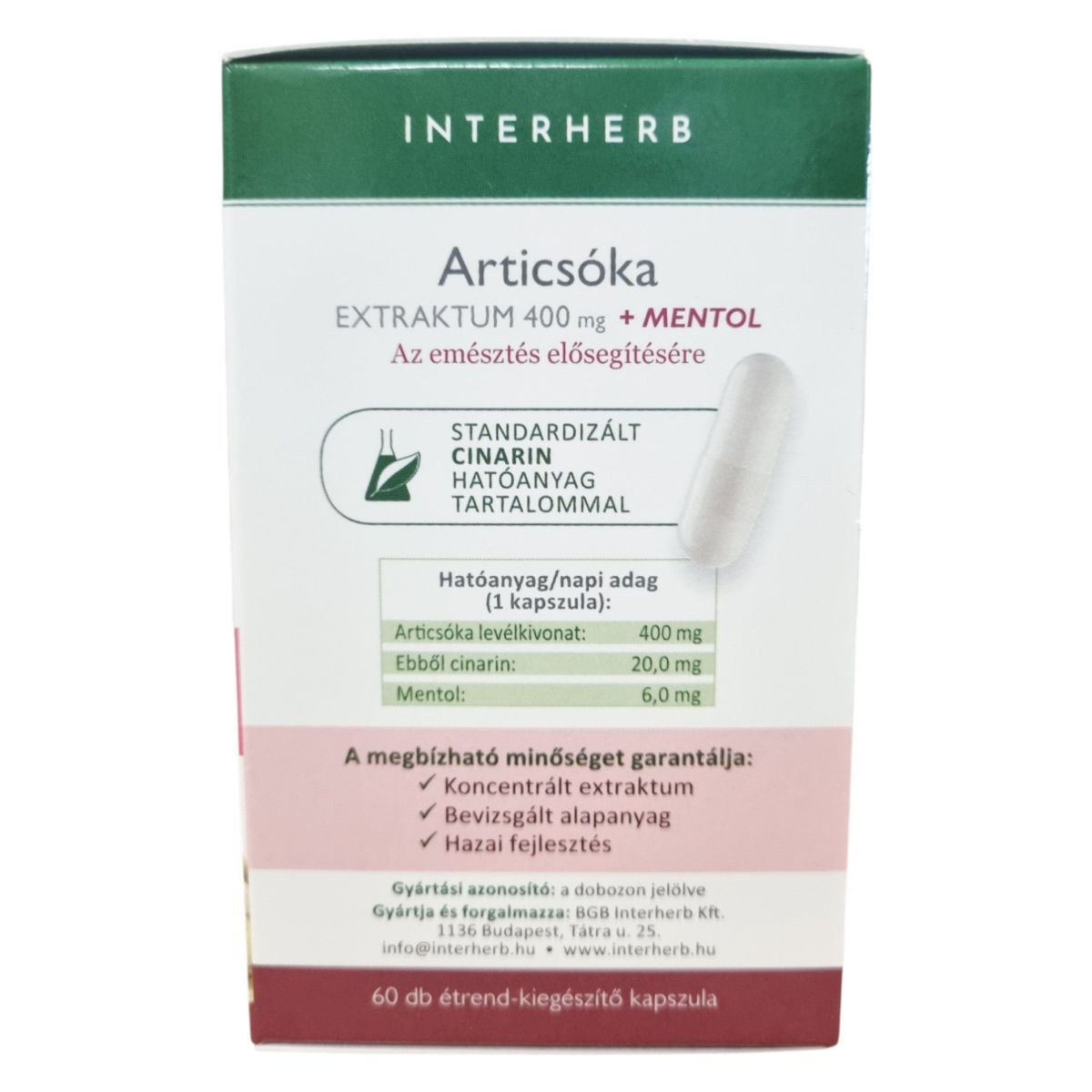 Az INTERHERB Articsóka EXTRAKTUM 400 mg + MENTOL kapszula az emésztés elősegítésére szolgál, különösen a nehéz, zsíros ételek fogyasztása után. Az articsóka hozzájárulhat a belek megfelelő működéséhez és a máj egészségének megőrzéséhez. A termék koncentrált extraktumot tartalmaz, amely megbízható minőséget garantál. Az articsóka levélkivonat Olaszországból származik, és a termék hazai fejlesztés eredménye. A kapszula kristályos mentolt is tartalmaz, amely segíthet az emésztőrendszer működésének támogatásában.