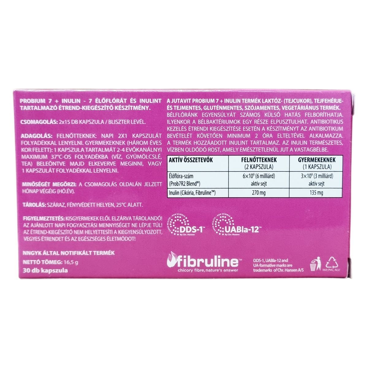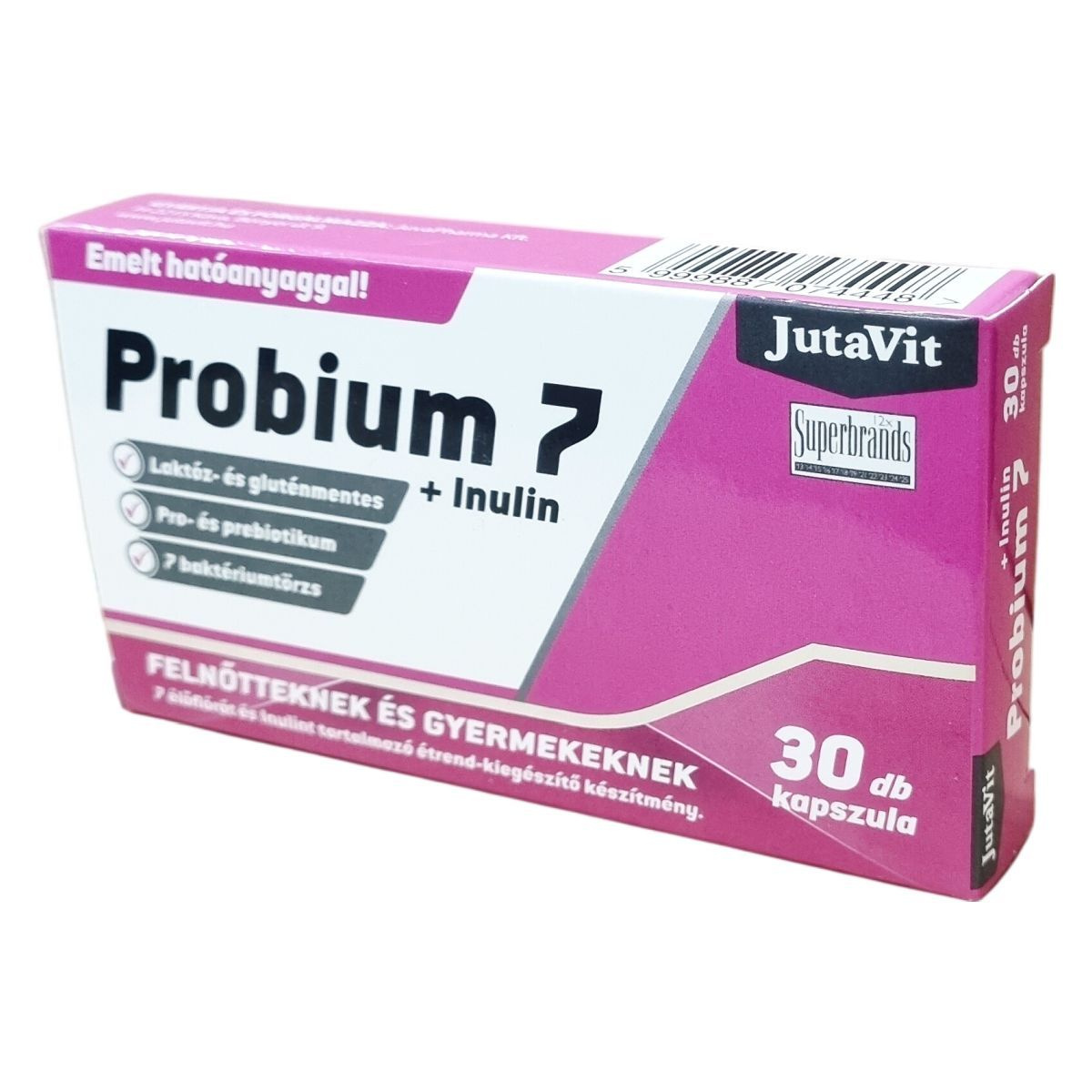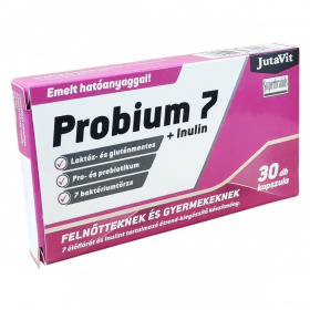 A JutaVit Probium 7 + Inulin egy olyan étrend-kiegészítő, amely 7 különböző baktériumtörzset és inulint tartalmaz. Az inulin egy természetes, vízben oldódó rostanyag, amely emésztetlenül jut el a vastagbélbe, segítve a bélflóra egészséges egyensúlyának fenntartását. A termék laktóz-, tejfehérje- és gluténmentes, így érzékenyek is alkalmazhatják. A kapszulák felnőttek és gyermekek számára egyaránt ajánlottak, külön adagolással. A hatóanyagkoktél 7 jól bevált probiotikus törzsből áll, melyeket a Prob7R2 Blend® együttese alkot. A terméket száraz, fényvédett helyen kell tárolni, az optimális hatás érdekében az antibiotikum-kezelést követő szünet betartása ajánlott. A csomagolás 30 kapszulát tartalmaz, mely 15 kapszulás bliszterekben található.