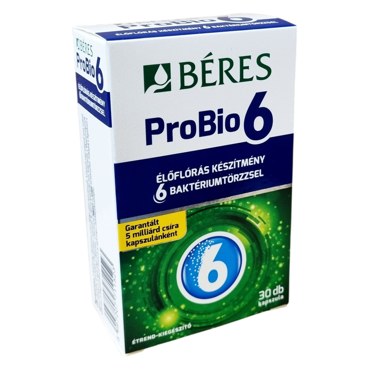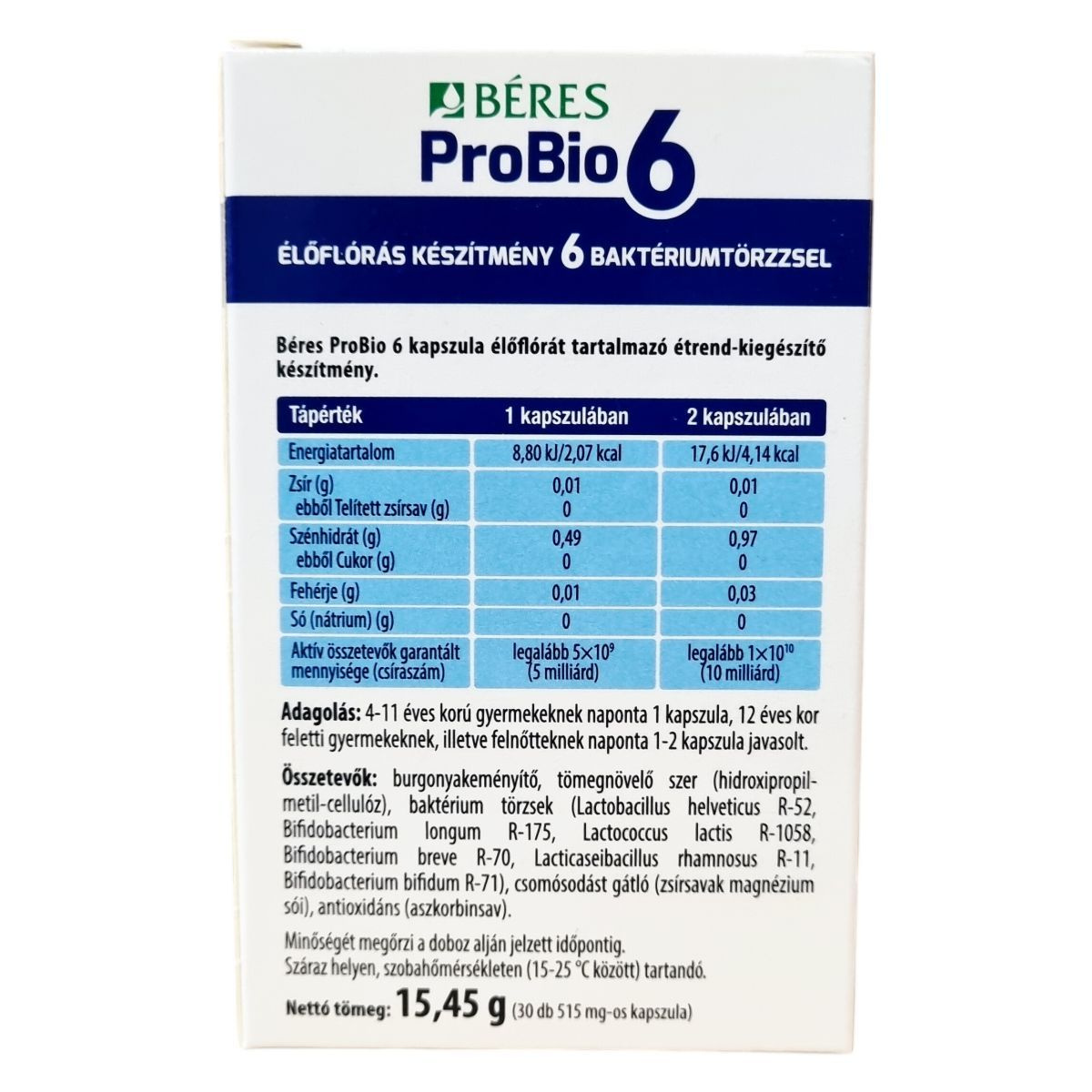 A Béres ProBio 6 kapszula olyan élőflórás étrend-kiegészítő, amely hatféle, az emberi bélflórában is megtalálható jótékony baktériumtörzset tartalmaz. A termék garantáltan legalább 5 milliárd élő baktériumot tartalmaz kapszulánként, ami 30 adagolást biztosít egy dobozban. Az összetevők között megtalálhatók a baktérium törzsek mellett a burgonyakeményítő, csomósodást gátló anyagok és antioxidáns. A terméket ajánlott 4 éves kor felett alkalmazni az ajánlott adagolási mennyiség szerint, és gyermekektől elzárva tárolni. A készítmény nem helyettesíti a kiegyensúlyozott étrendet és az egészséges életmódot, továbbá tartalmazhat tejport és szóját, ezért érdemes figyelembe venni allergén információkat. A termék tárolása során célszerű a megadott hőmérsékleti tartományt betartani a minőség megőrzése érdekében.