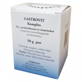 A Gastrovit Komplex por prebiotikumokat, élőflórás probiotikumokat és vitaminokat tartalmazó étrend-kiegészítő készítmény, amely hozzájárulhat az emésztőrendszer normál működéséhez és az immunrendszer támogatásához. Kiszerelés: 50 g por. Előállítja: Premium Product Kft.